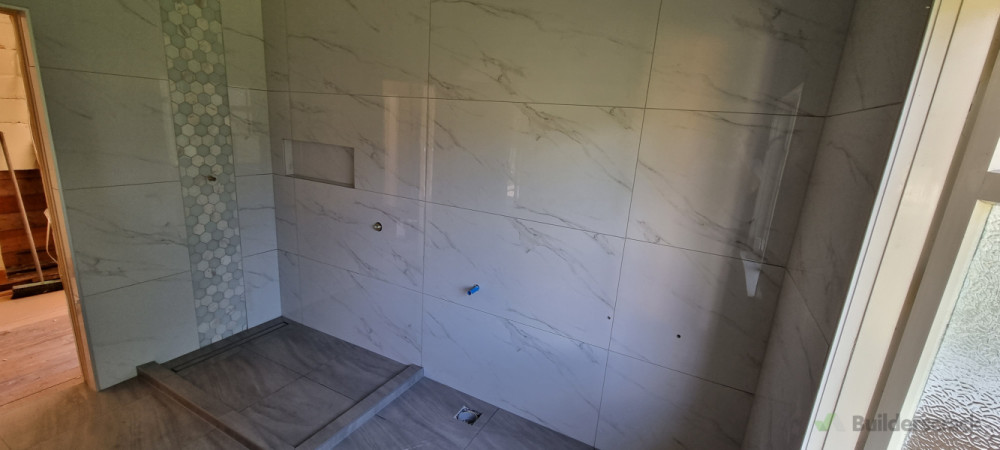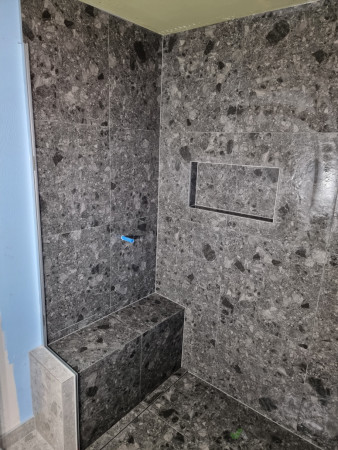 In short: we've engaged Sean on two separate occasions and we couldn't be happier! We'll contract Sean for all our future tiling needs and highly recommend him to others. Job 1 - 2020: Bathroom floor, enclosed shower (smoke grey double herring bone design), toilet floor and laundry floor. Job 2 - 2021: a) Main bathroom and Ensuite: floor to ceiling tiles, 3m studs, niches, hobs, and underfloor heating. Floor tiles, standard. Wall tiles included standard and hexagon feature strip. b) Laundry cupboard/nook: floor to ceiling tiles. c) Kitchen nook backsplash (ice blue double herring bone design). So happy he convinced me to do underfloor heating! We use it ALL the time. This is the experience you need when doing something for the first time. We are a few years on now, and we couldn't be happier with how everything is holding up. From initial quote, right through to finished products Sean was awesome to work with. Took time to understand my vision, then consulted on some of the challenges we would face along the way, was clear about what and when he needed things by (e.g. plumbing, straight floor/wall lines, niche styles and grout thickness/colour), and allowed me to make the final decisions. Sean was always on time, super professional, and kept me in the loop throughout the whole process. I really appreciated his 'no surprises' mindset, raising concerns early if something happened out of his control. The quality of his work is top-notch, and my spaces still look incredible today. If you need a skilled and reliable tiler, I highly recommend Sean. Thanks, Sean, for doing such a fantastic job! Photo 1: Grey Smoke subway tile, double herring bone layout. Feature wall in main bathroom (job 1) Photo 2-4: Main Bathroom. Grey marle floor tile, tray drain, hob. Hexagon feature strip, Wall tile standard carrara grey tile. Photo 5: Laundry nook. Photo 6: Ensuite (all the same tiles as the bathroom) Photo 7 - 9: Kitchen splashback. Ice blue subway tile, double herringbone layout. Reply: We’re thrilled you’re happy with the service – thanks for sharing!