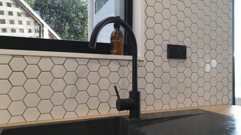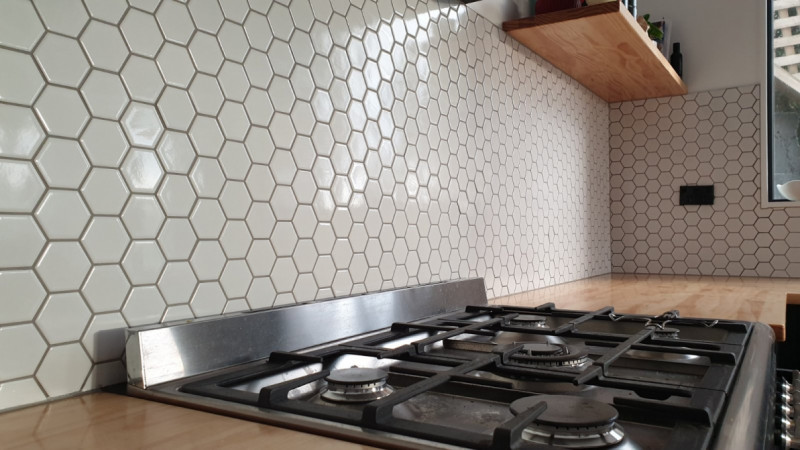 Stunning large marble hexagon mosaic tiles adding luxury and texture to a kitchen splashback, designed by Direct Tiling