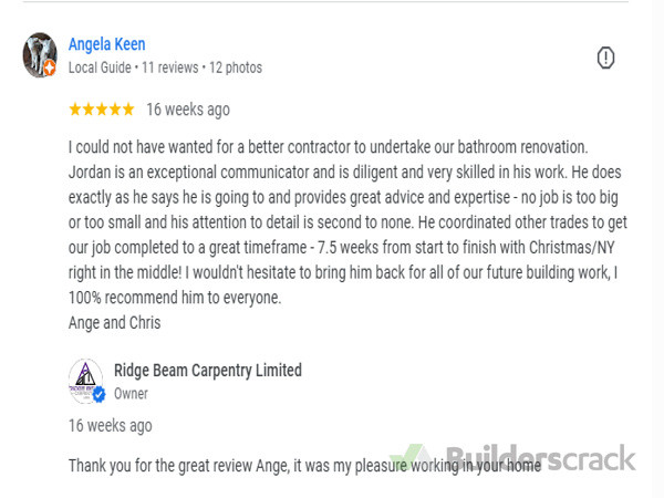 We had a wonderful experience with Ridge Beam Carpentry, Jordan was timely and efficient with exceptional communication keeping us updated along the way with the process and any unexpected findings. Jordan went above and beyond facilitating other tradies for the job and even kept to the quote. Will happily work again with Jordan for future projects and would recommend to anyone looking for builder. Reply: Thank you so much for your kind words and support! It was a pleasure working with you on your project. I'm glad to hear you felt well-informed throughout the process and that everything went smoothly. I really appreciate the recommendation and would be more than happy to work with you again in the future! — Jordan