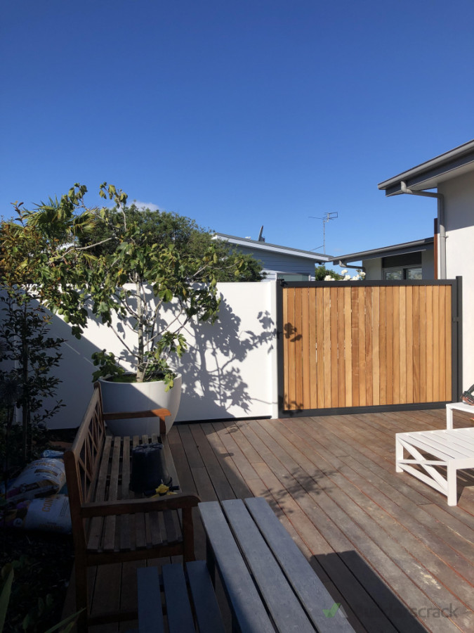 Dressed Paling Fence with Custom Steel Frame Roller Gate