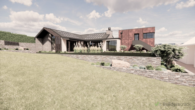 This home is a seamless composition of natural materials, thoughtful craftsmanship, and contemporary refinement, creating a strong yet elegant presence within its environment. Locally sourced stone forms the backbone of the design, grounding the structure in its surroundings while creating a continuous flow from exterior walls to interior fireplaces, reinforcing a sense of permanence and cohesion. Corten steel cladding, with its evolving patina, introduces a rich, organic contrast against the cooler tones of the corrugated metal roofing, which adds a contemporary edge and durability. Timber elements, from exterior pergolas to exposed interior beams, soften the composition, bringing warmth and authenticity to the design.