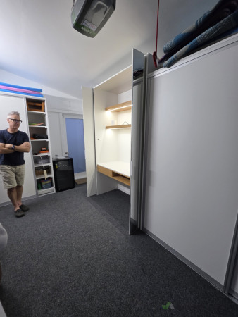 Project Overview: The client needed a dedicated office space but did not have room inside the house. We transformed part of their garage into a functional, modern, and space-efficient home office with built-in storage, sliding doors, and a pocket door system. The goal was to maximise usable space while keeping the area clean, organised, and practical. Scope of Work: Planning and measuring a compact office layout within limited garage space Constructing a custom office enclosure with clean lines and modern detailing Installing pocket doors for the office entry to save floor space Fitting sliding wardrobe-style doors with mirrors to enhance light and visual space Creating slatted shelving storage for organised and easy-access storage Building custom cabinets for office use and general storage Adding panels, trims, and finishing pieces for a seamless, built-in look Ensuring all doors ran smoothly with soft-close systems where applicable Full clean-up and final detailing Result: The unused garage area was successfully converted into a stylish, functional home office. The pocket doors and mirrored sliders made the space feel larger and more open, while the slat shelving provided practical, clean storage solutions. The client was extremely happy with the transformation and the clever use of available space. Client Feedback: The client appreciated the efficient design, clean finish, and the professional way the project was completed from start to finish.
