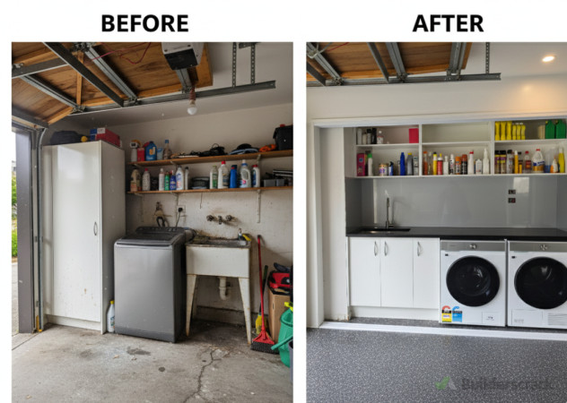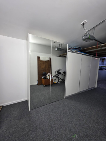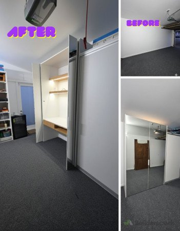Project Overview: The client needed a dedicated office space but did not have room inside the house. We transformed part of their garage into a functional, modern, and space-efficient home office with built-in storage, sliding doors, and a pocket door system. The goal was to maximise usable space while keeping the area clean, organised, and practical. Scope of Work: Planning and measuring a compact office layout within limited garage space Constructing a custom office enclosure with clean lines and modern detailing Installing pocket doors for the office entry to save floor space Fitting sliding wardrobe-style doors with mirrors to enhance light and visual space Creating slatted shelving storage for organised and easy-access storage Building custom cabinets for office use and general storage Adding panels, trims, and finishing pieces for a seamless, built-in look Ensuring all doors ran smoothly with soft-close systems where applicable Full clean-up and final detailing Result: The unused garage area was successfully converted into a stylish, functional home office. The pocket doors and mirrored sliders made the space feel larger and more open, while the slat shelving provided practical, clean storage solutions. The client was extremely happy with the transformation and the clever use of available space. Client Feedback: The client appreciated the efficient design, clean finish, and the professional way the project was completed from start to finish.