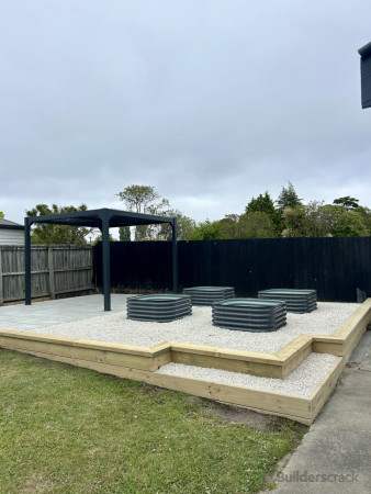 Our work includes decking, pergolas, fencing and screens, retaining walls, paving and patios, driveways, outdoor living areas, fire pits, drainage, irrigation, lawns (natural and artificial), and planting.