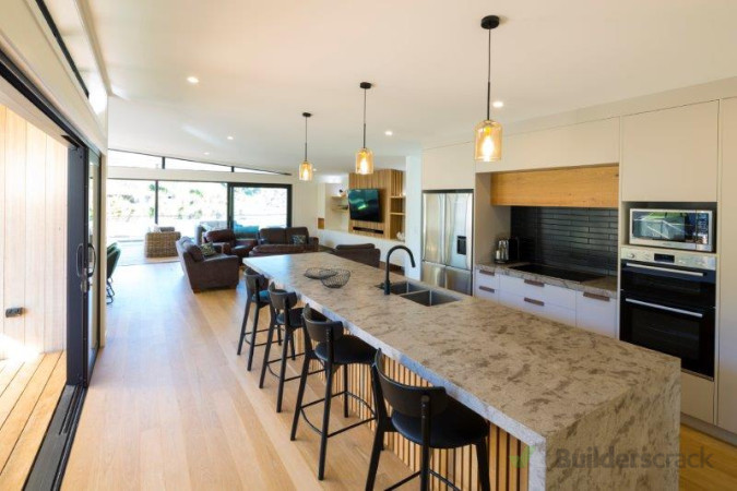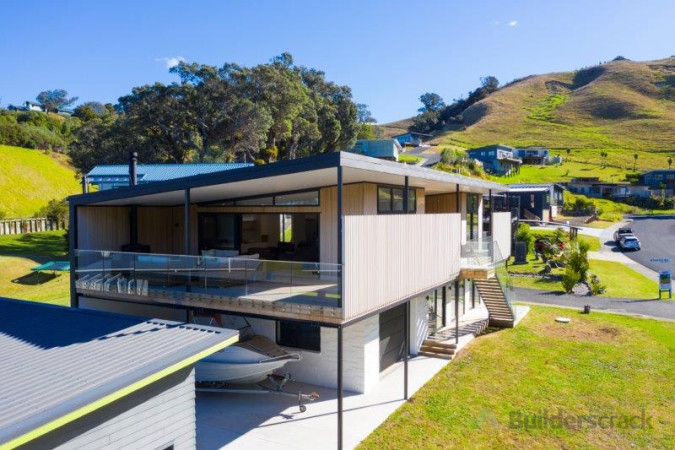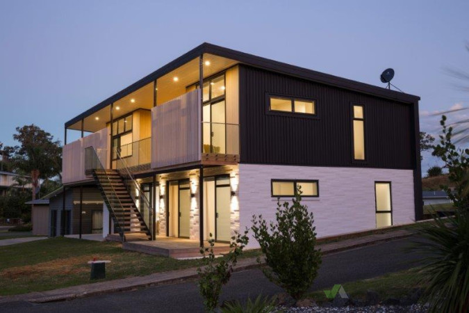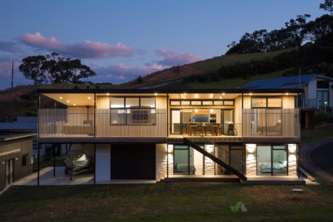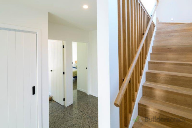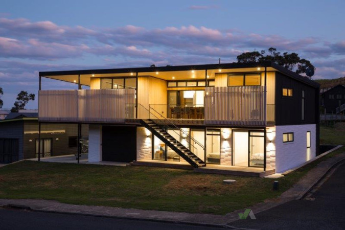 It was obvious from the outset that the living spaces would need to be at first floor level to have any chance of achieving privacy. The master suite is positioned for privacy at the western end of the first floor. The sleeping/guest wing is positioned at ground floor, allowing good winter sun into the bedrooms. Ground and first floor levels are linked by both an internal stair and exterior feature floating stair forming the main entry to the house.