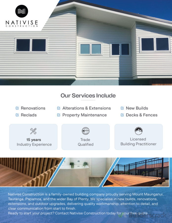 Locally owned and operated, Nativise Construction is a licensed and qualified building company committed to delivering quality workmanship and genuine client satisfaction. With over 15 years in the trade, we bring the skills, knowledge, and attention to detail needed to get your project completed on time and to the highest standard. From start to finish, you can count on us for reliable service, clear communication, and results that last.