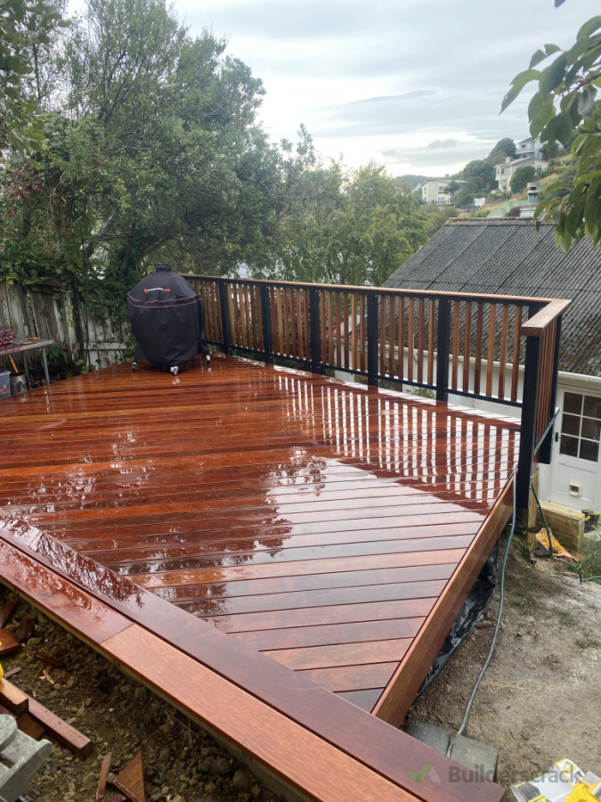 This was a large kwila deck with really cool angles and a built in 5m bench along with a wrap around balustrade. I built the deck above two retaining walls that I built in order to create a flat platform.