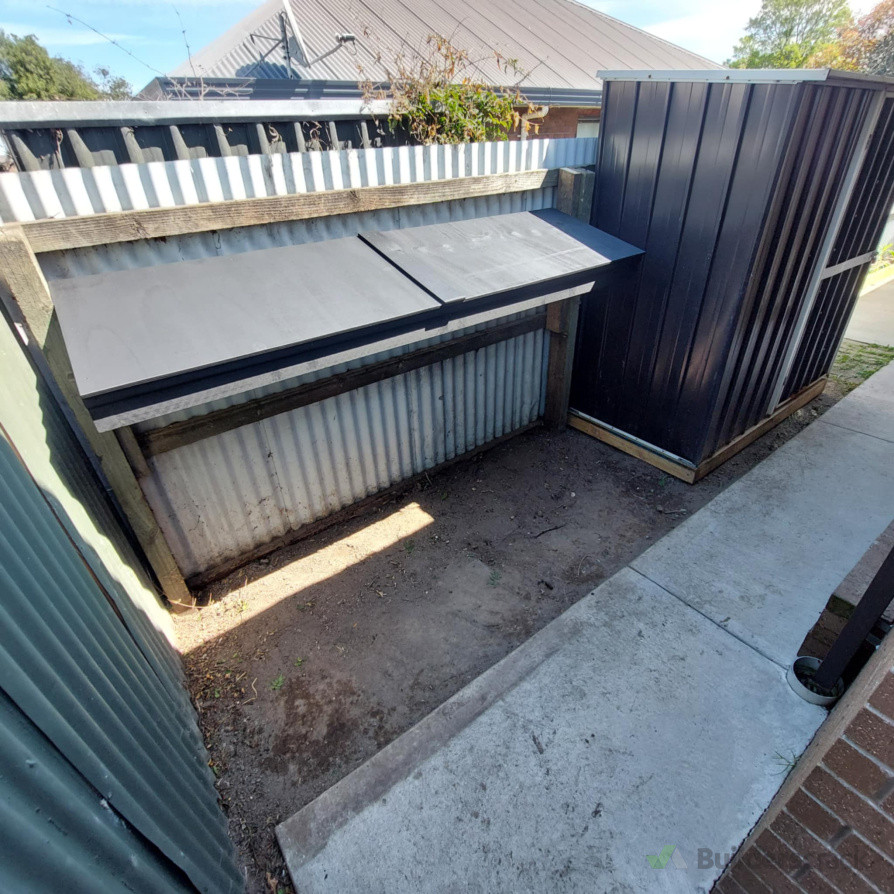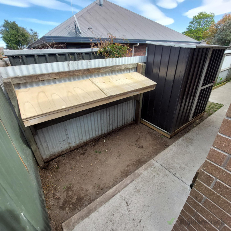 Weeds removed and excess soil taken away to level area. Shed based installed.