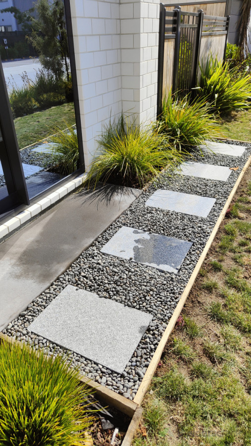 The mirrored windows were shining the sun on to the grass killing it. We removed the grass and Installed pavers and stones!
