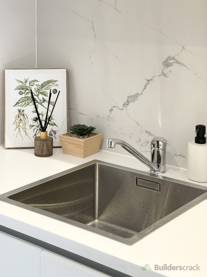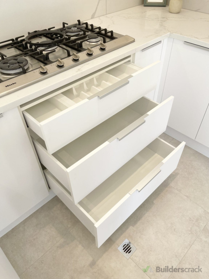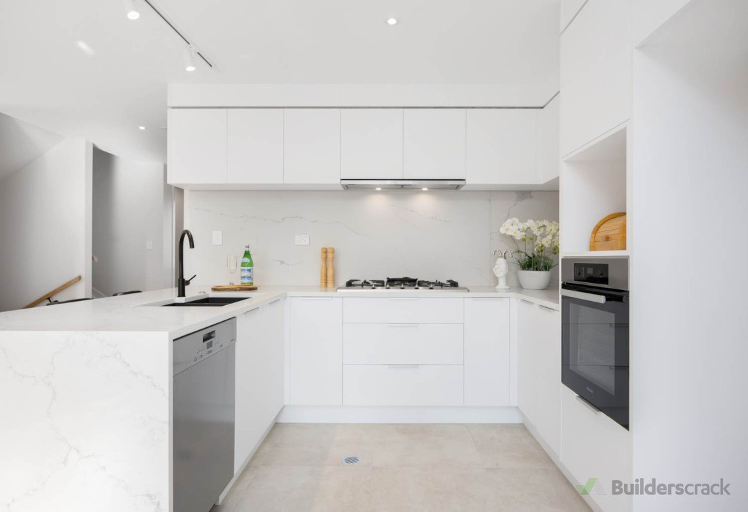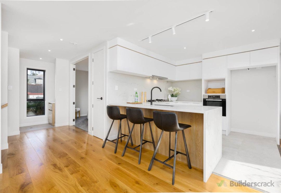Beautifully crafted, meticulously planned interiors are imbued with the warmth of natural wood and sandstone, providing a stunning canvas for effortless living. Pared with white stone benchtops, striking silver joinery and tapware, integrated cabinetry is finely detailed to add contemporary character.