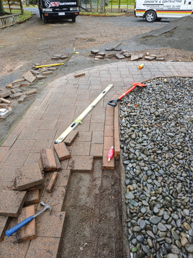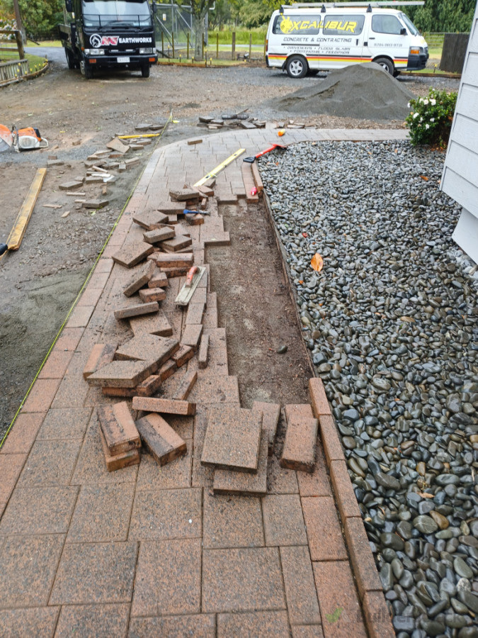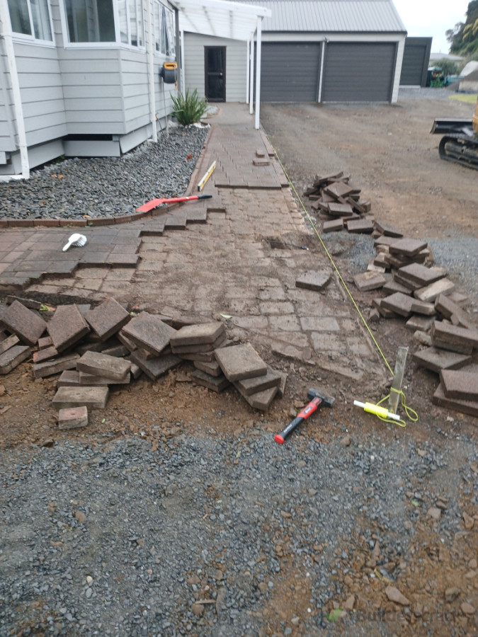 Uplift old uneven pavers, relevel, compact and recreate radius bend, set, cut and lay pavers ready for new concrete driveway to be laid