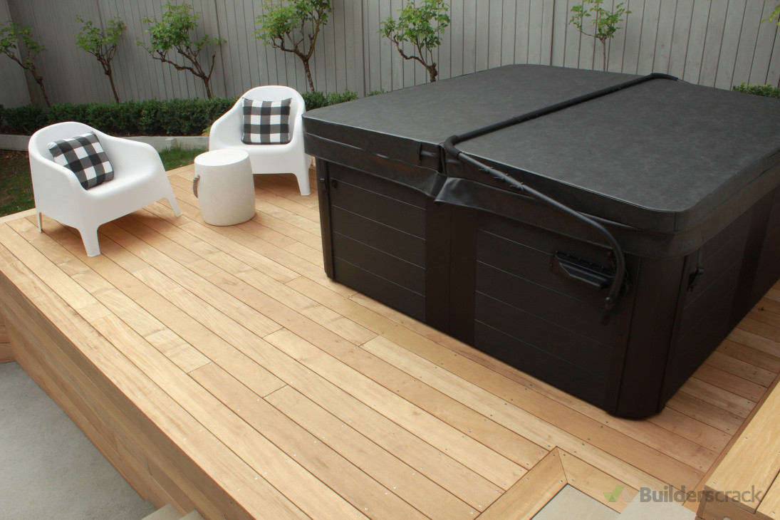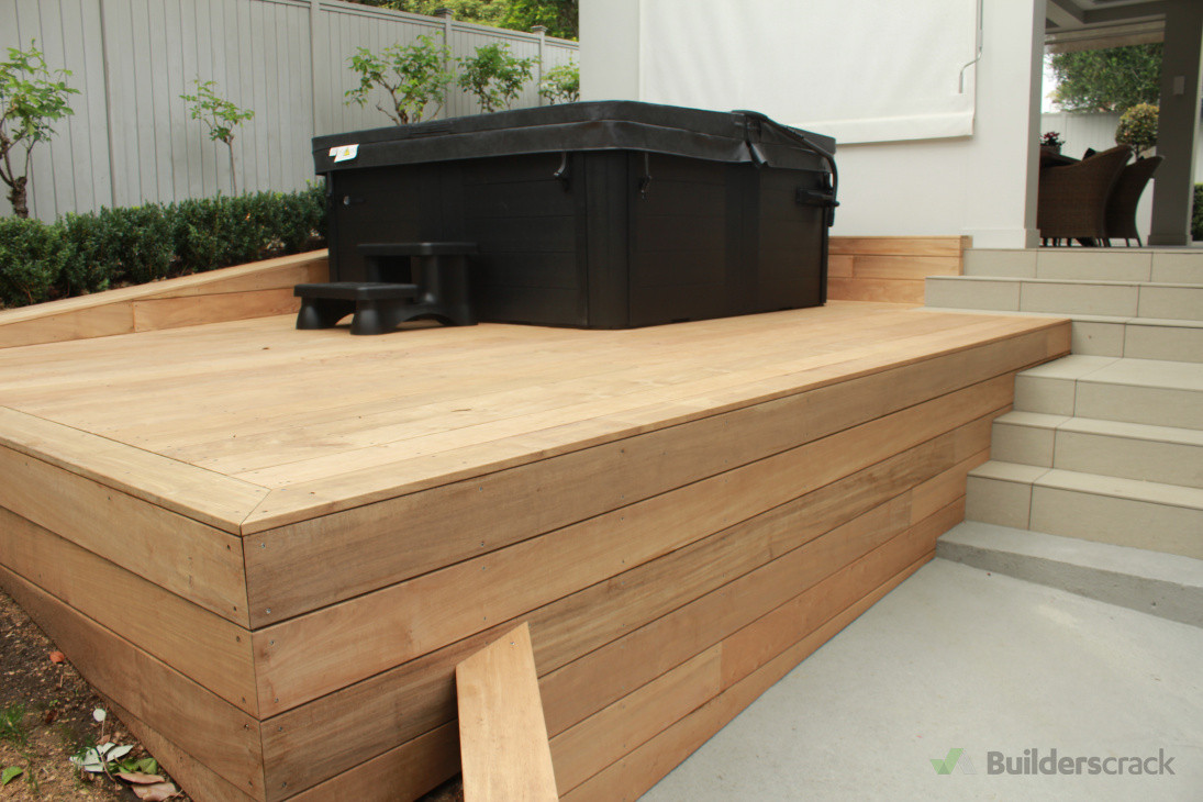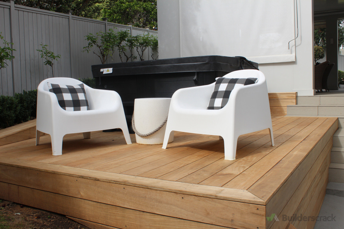 A small and simple, but expertly crafted timber deck and retaining makes the perfect spot for a relaxing spa