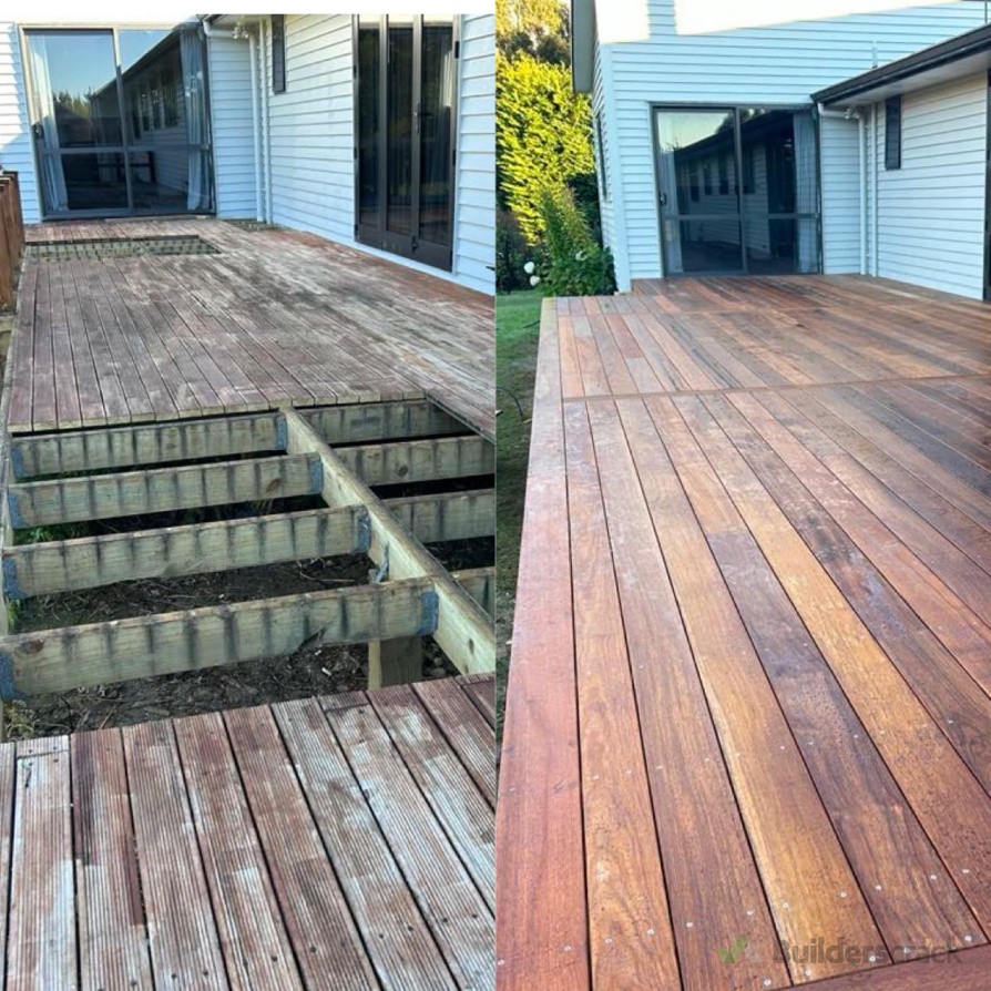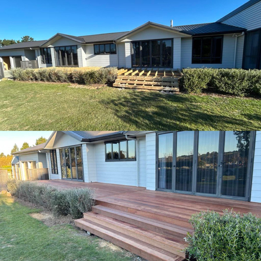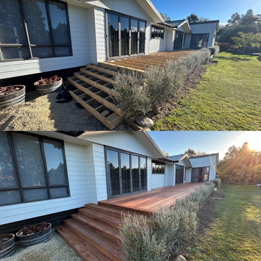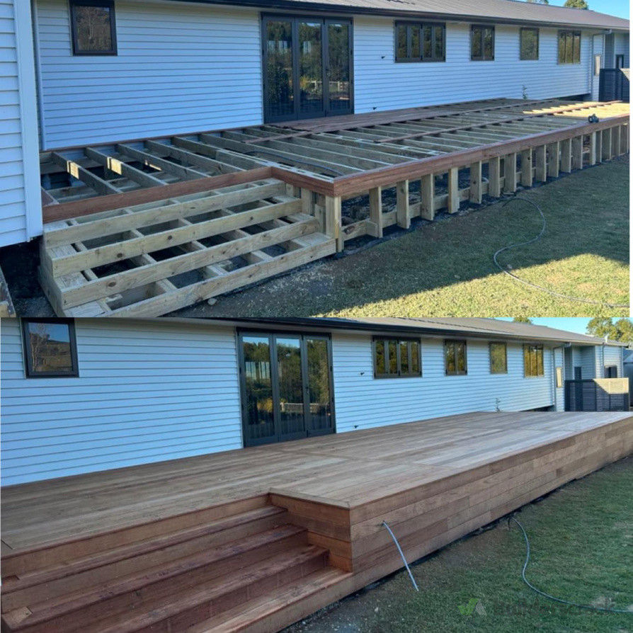 The clients asked us to replace and modify their existing decks with new Kwila hardwood decks. After inspecting the original decks it was recommended that we demolished the existing decks including all the framing and started again. We extended further out and removed the old handrails that were falling apart. In total there was 100 sqm of decking with new stairs completed