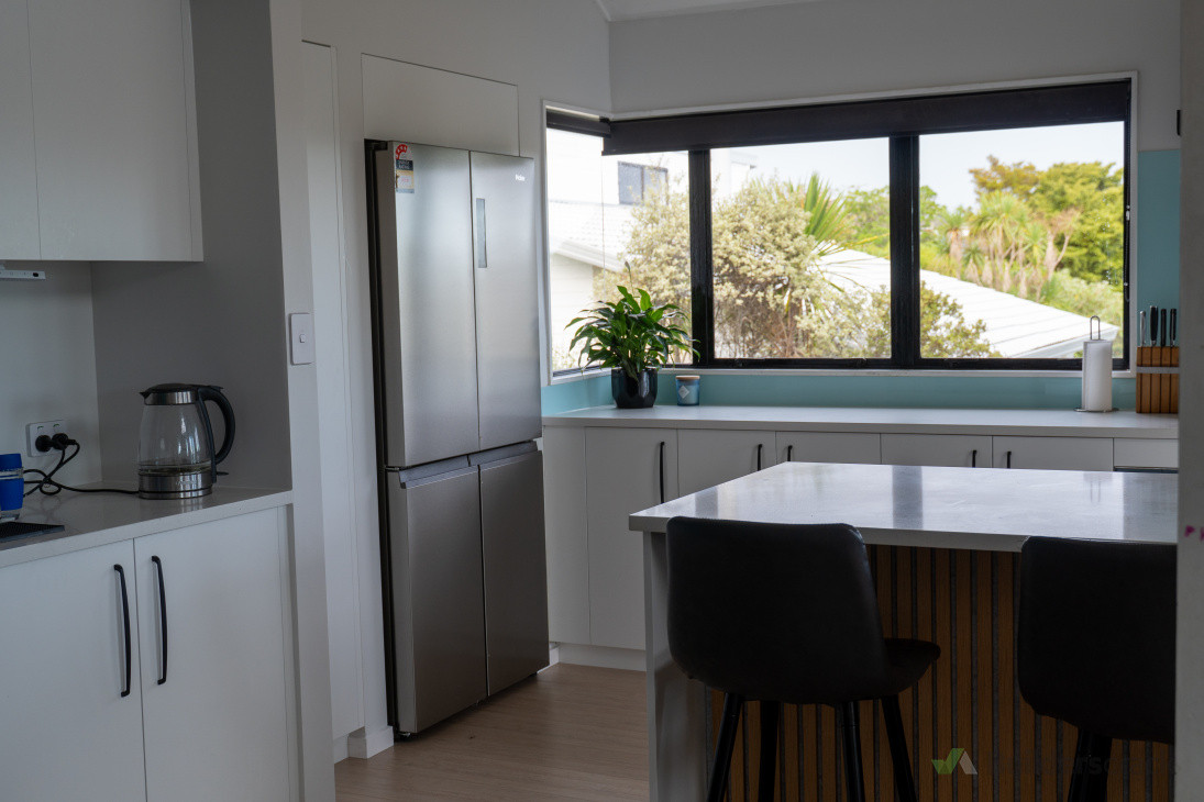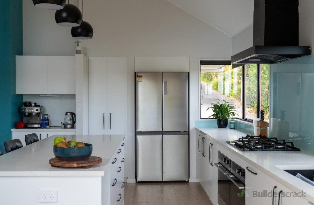 Kitchen in Torbay with limited budget, however white cabinets with black appliances always work.