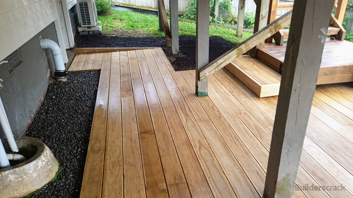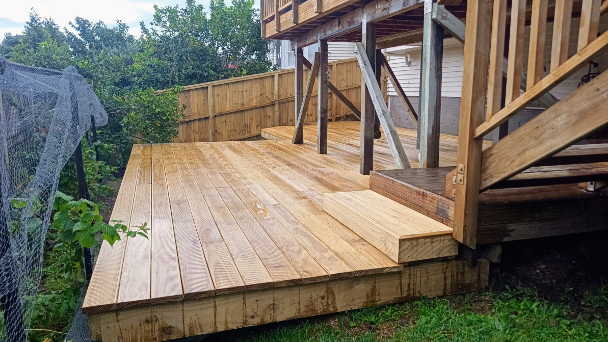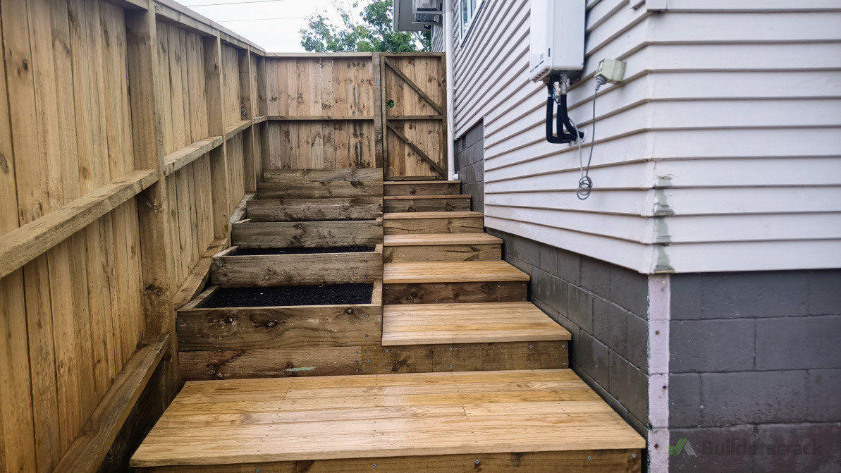 Amazing transformation with new pine deck , side access deck stairs and planters and new capped privacy fence.