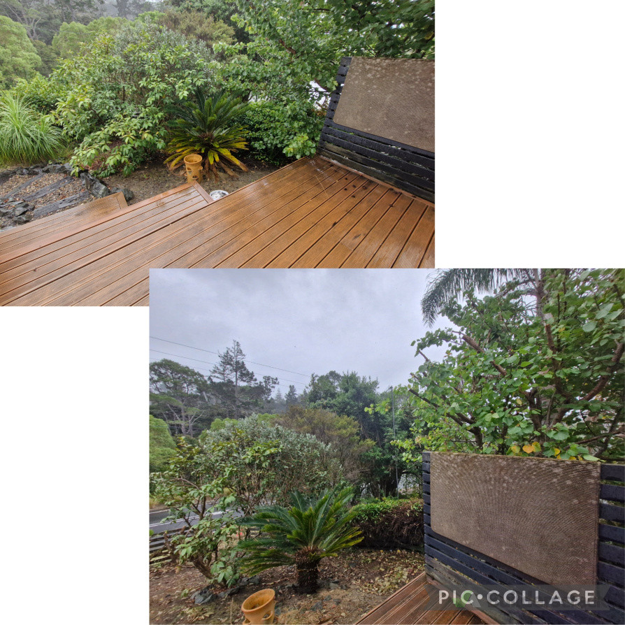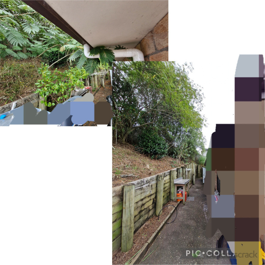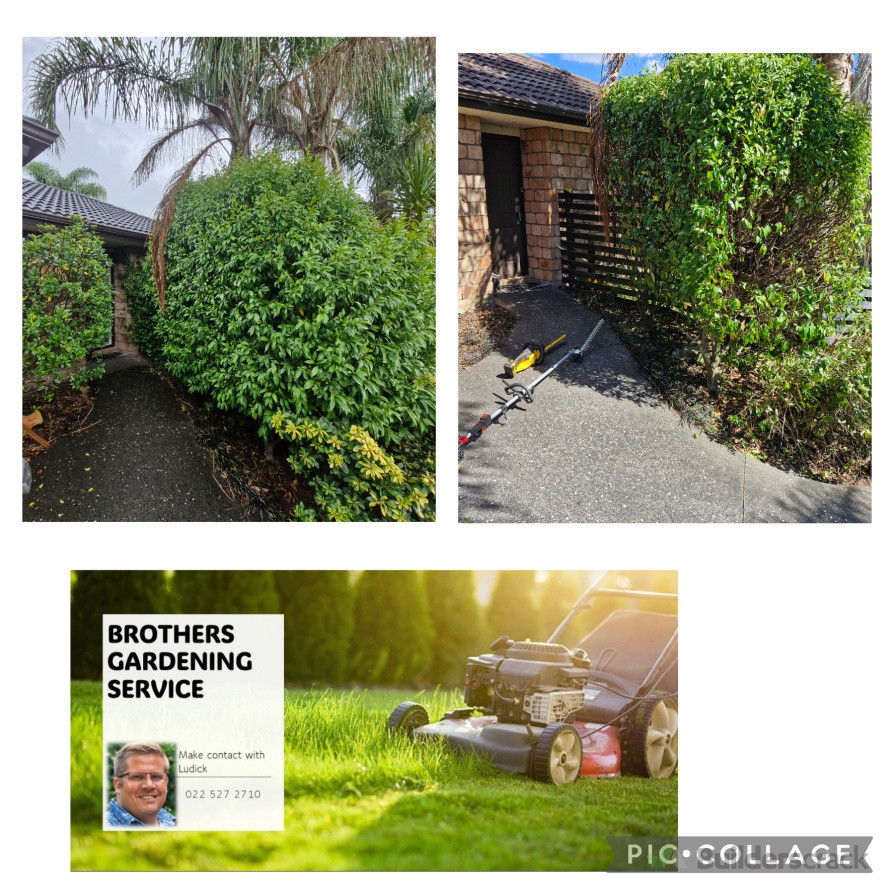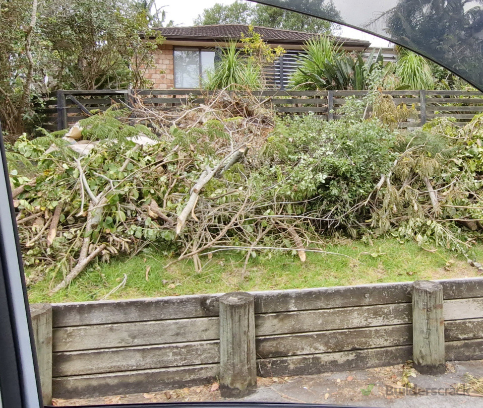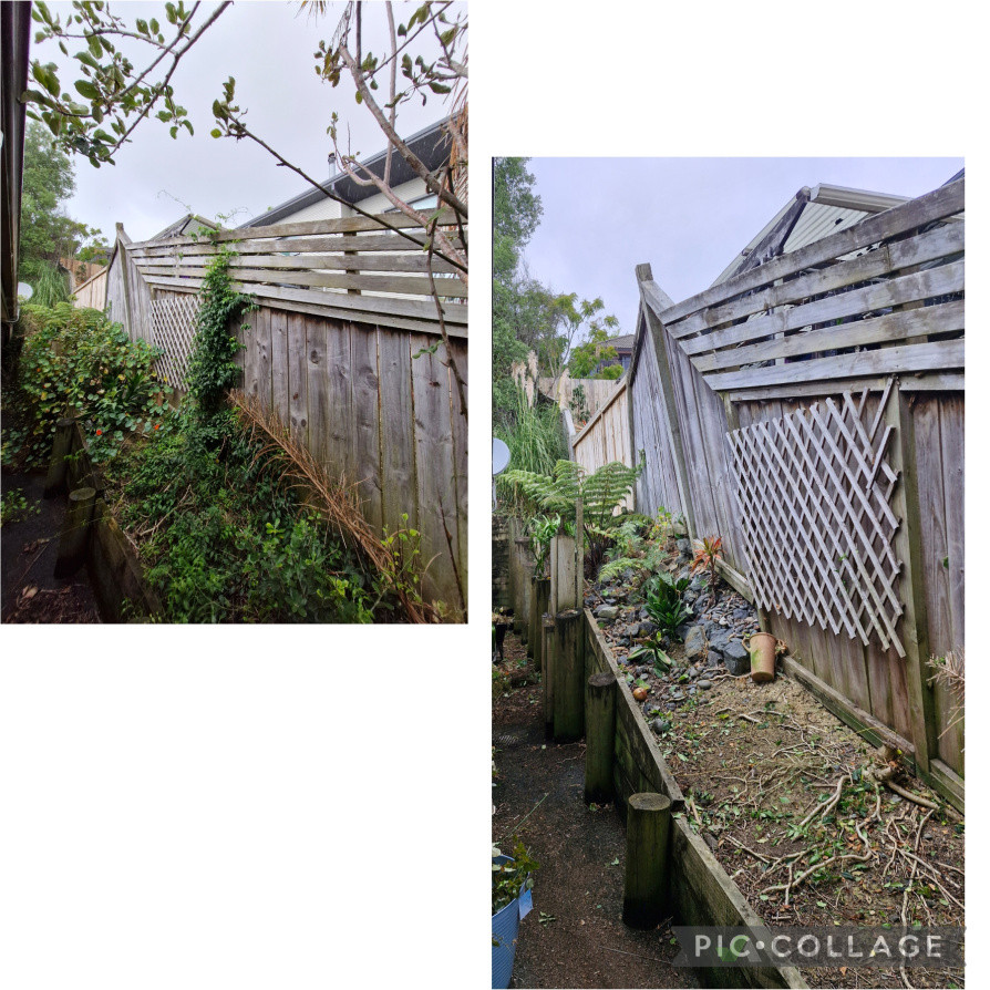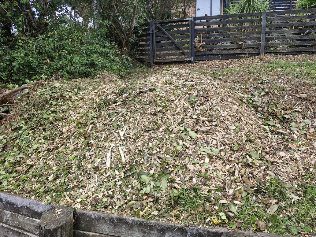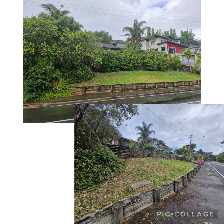 This was a big project. Consisting of Hedge trimming, tree trimming on the owner's property, weed whacking, weed spraying, clearing away old dead branches, etc. afterwards all plant material was mulched and put back into the garden for green mulch.
