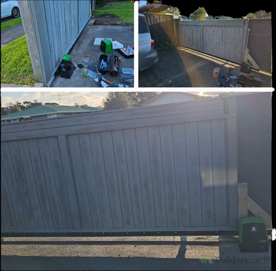 Repair gate my modification to rotten base. Add new wheels and extend concrete base. Increase gate size to allow for greater open and better operation. Install Centurion D5 smart gate motor.