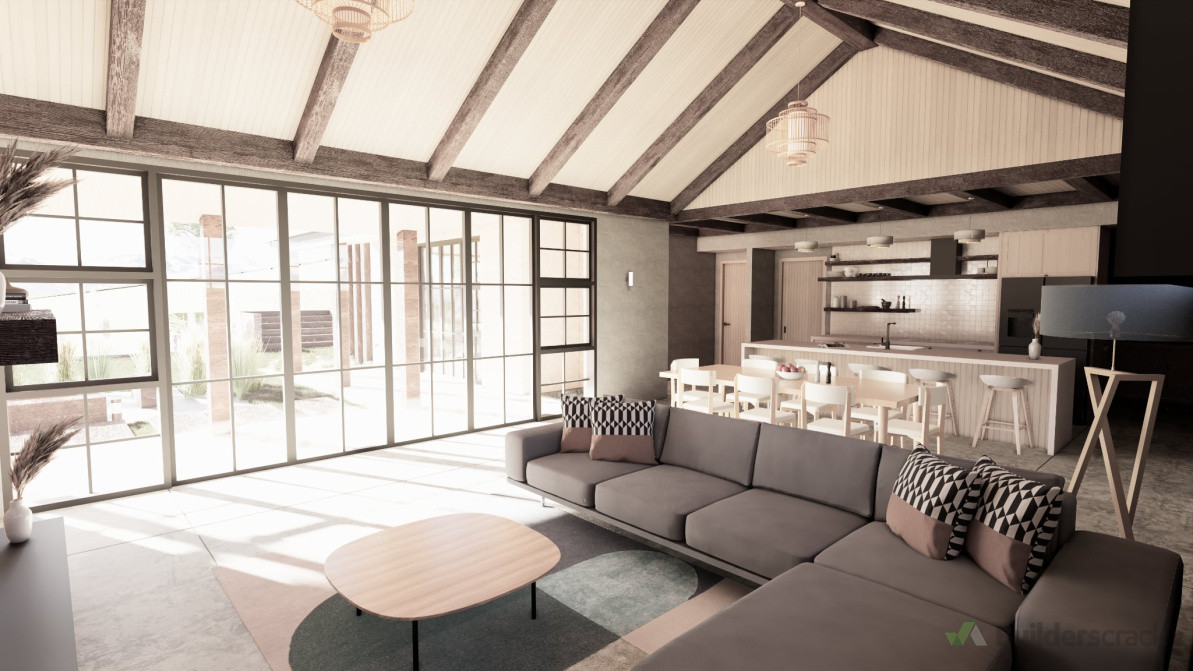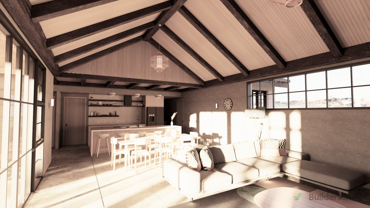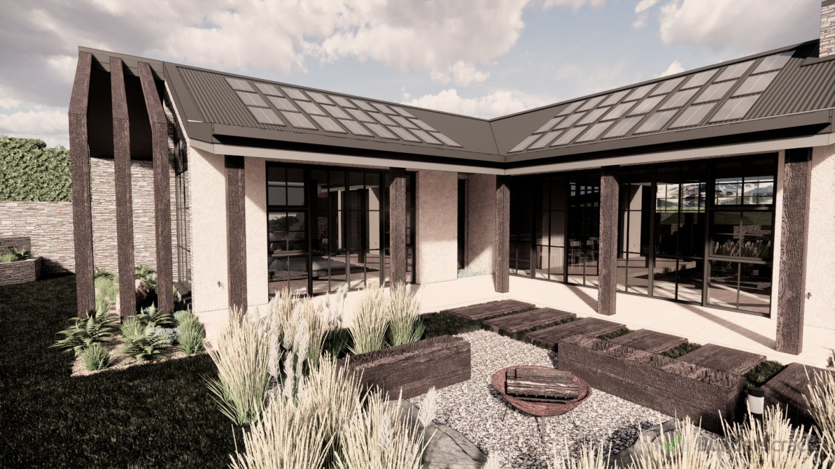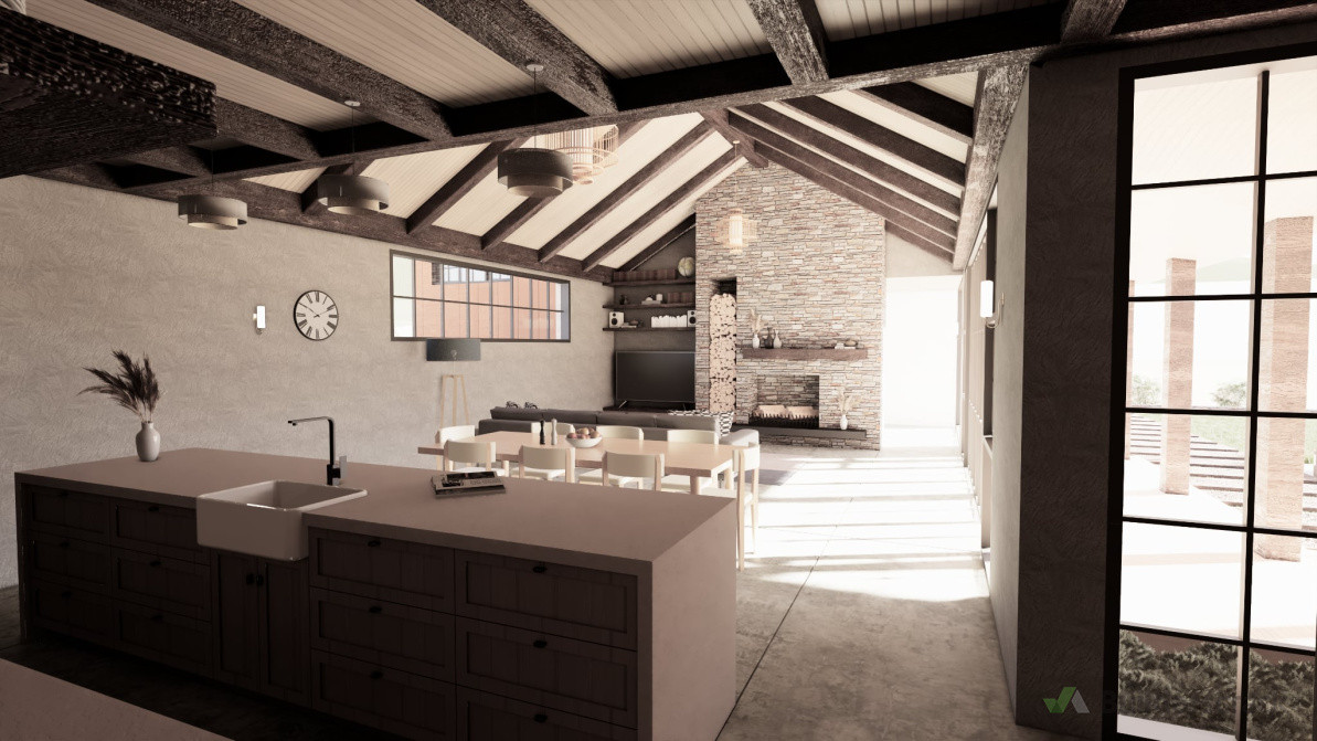 This home is a seamless composition of natural materials, thoughtful craftsmanship, and contemporary refinement, creating a strong yet elegant presence within its environment. Locally sourced stone forms the backbone of the design, grounding the structure in its surroundings while creating a continuous flow from exterior walls to interior fireplaces, reinforcing a sense of permanence and cohesion. Corten steel cladding, with its evolving patina, introduces a rich, organic contrast against the cooler tones of the corrugated metal roofing, which adds a contemporary edge and durability. Timber elements, from exterior pergolas to exposed interior beams, soften the composition, bringing warmth and authenticity to the design.