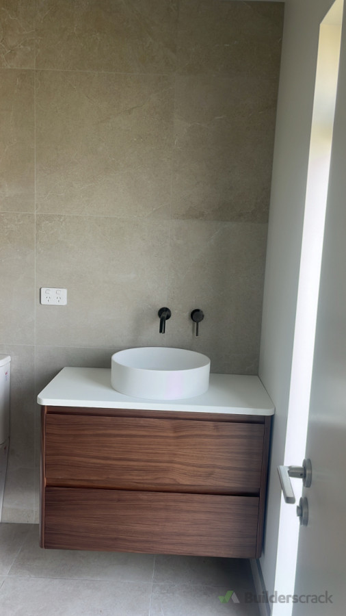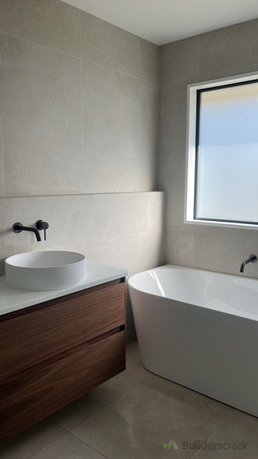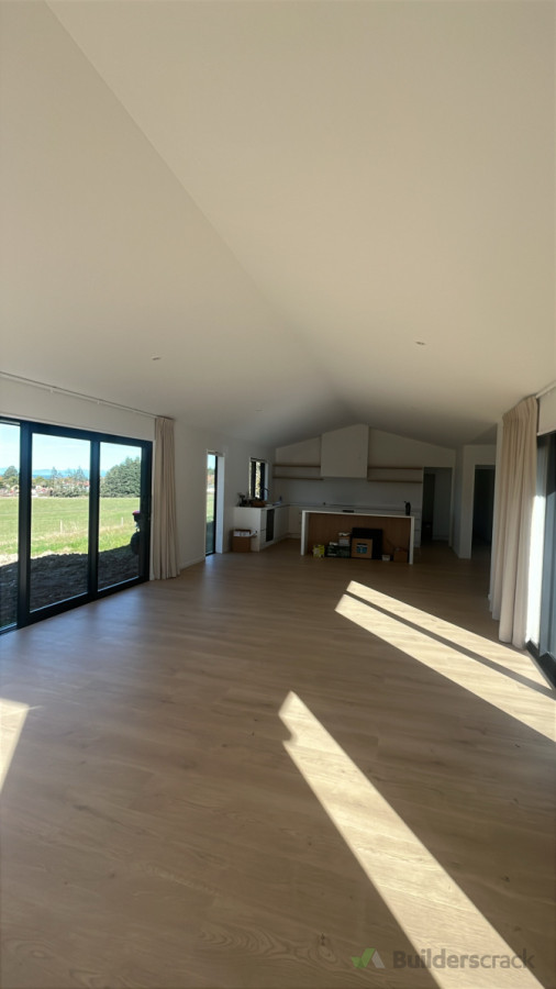 Construction of new 230 sqm 4 bedroom house in Ashley Forest. Abodo and James Hardie oblique cladding. Scissor truss ceiling in living kitchen, with engineered timber floating floor and tiled bathrooms throughout