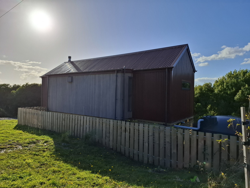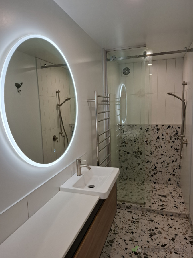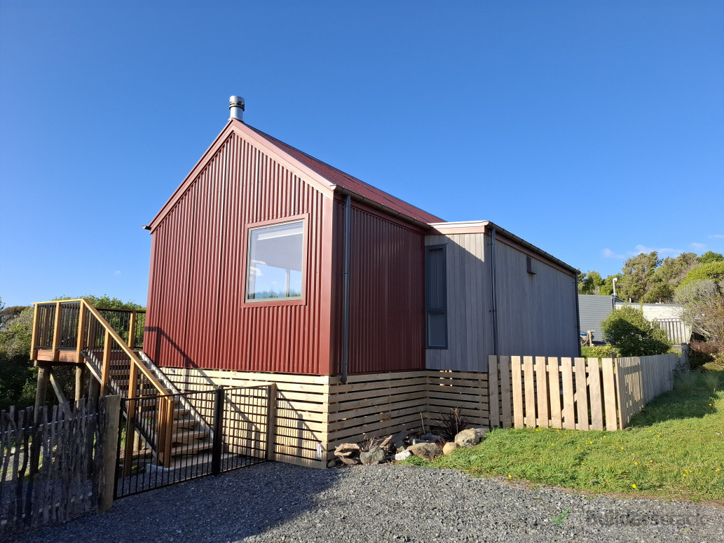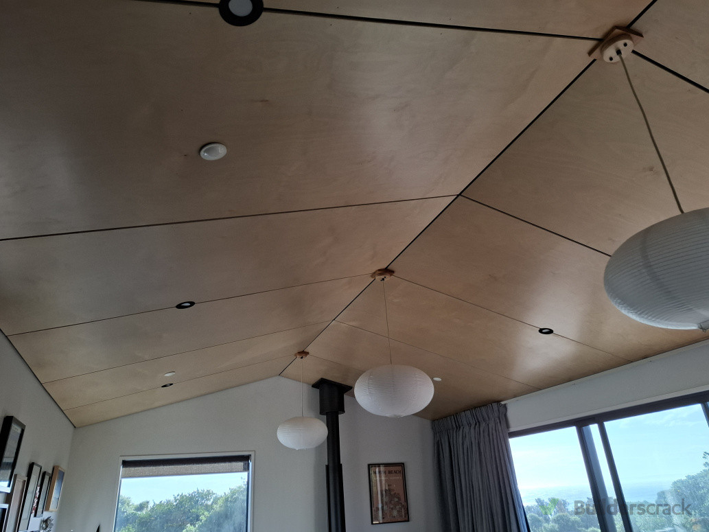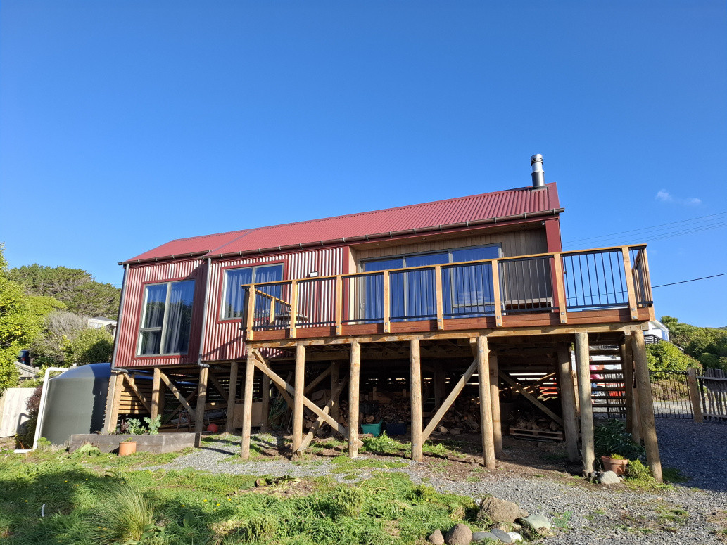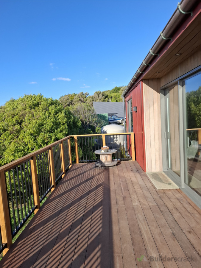Elevated Building with Different Cladding Materials , Kwila Decking with Steps , Negative Detail Prefinished Plywood Living / Dining Room Ceiling , Tiled Bathroom Floor and Shower.