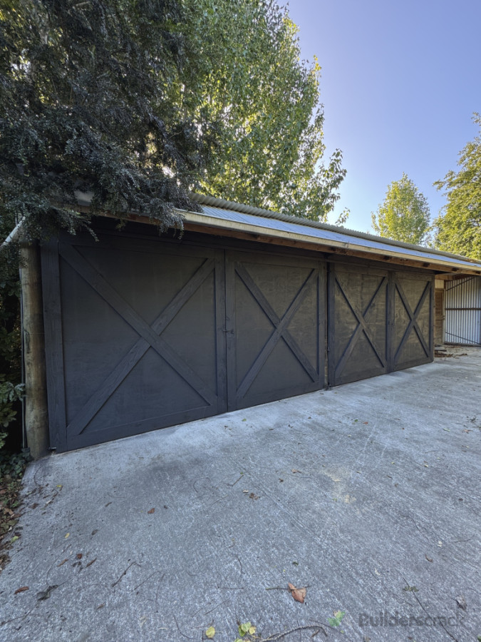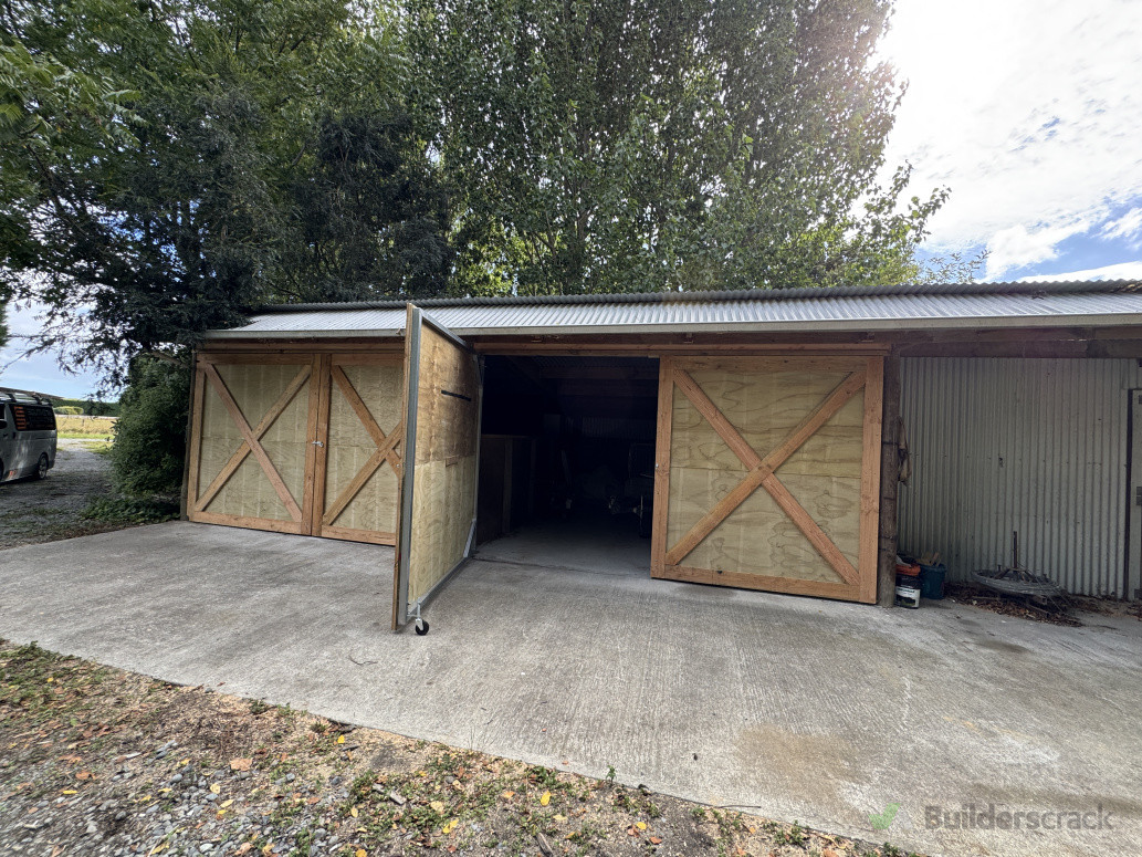 Really cool custom barn doors retro-fitted onto this pole shed. Custom frames with wheels made by Southern Buildworks. Painted for the client to top it off. Job well done!