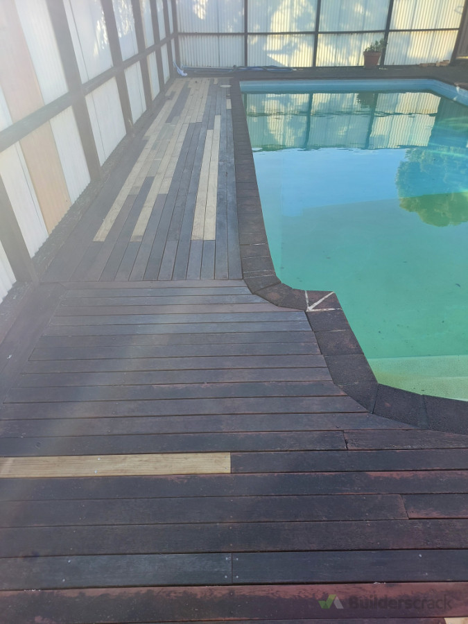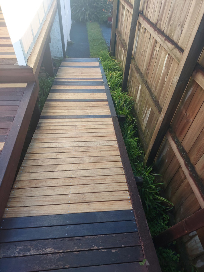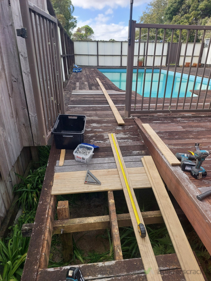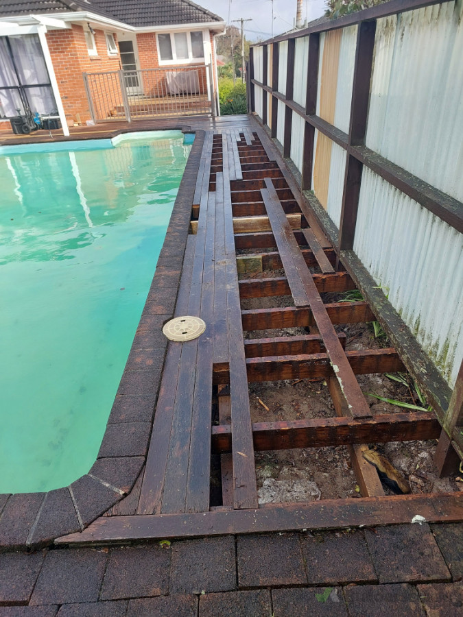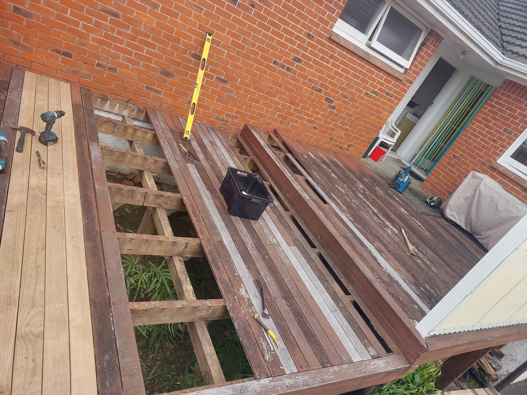 Old decking boards replaced, multiple joist and posts have been strengthened/supported/ replaced. Decking boards will be cleaned and painted.