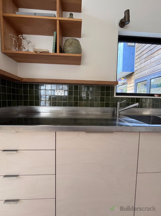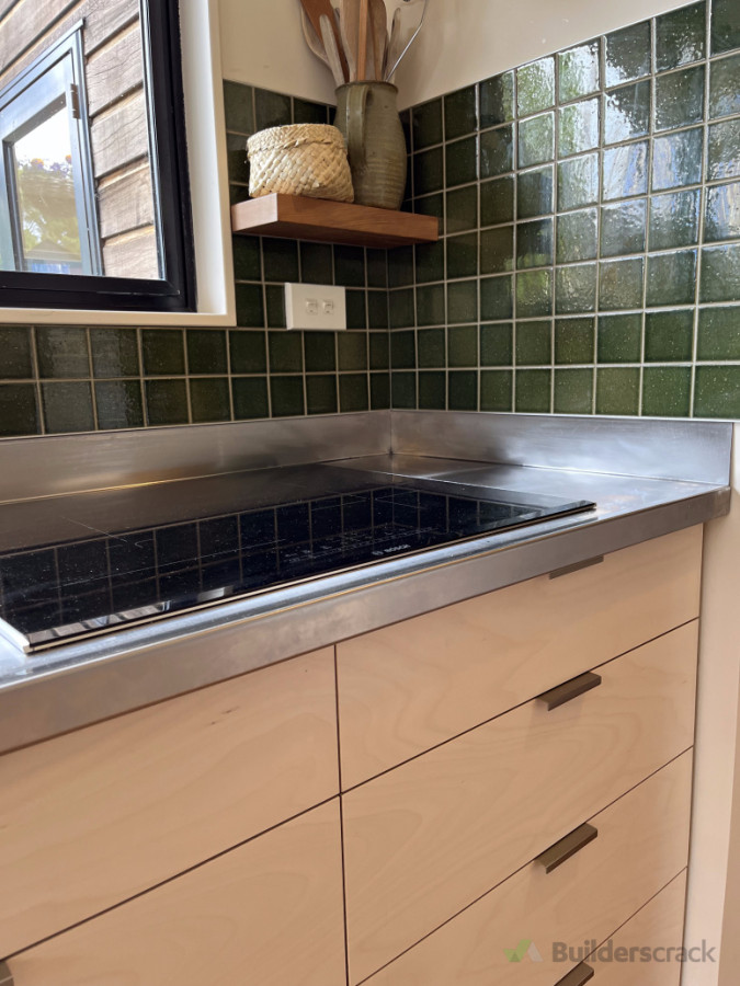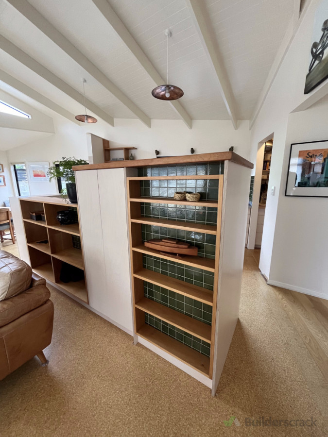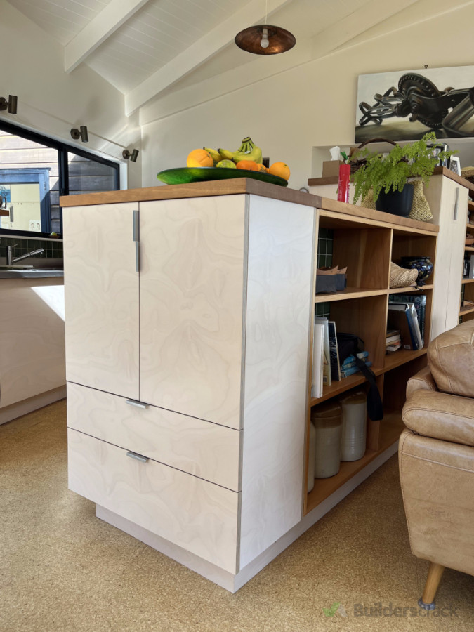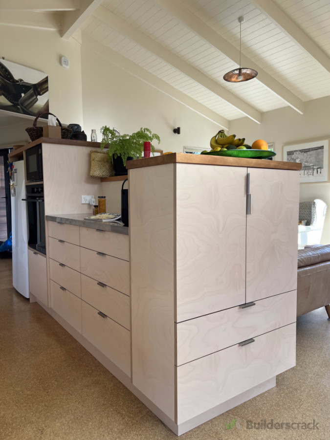 Top quality white wash birch plywood. Solid wood shelving. Solid wood and Stainless steel bench tops. Some Led strip lighting under wooden shelving.