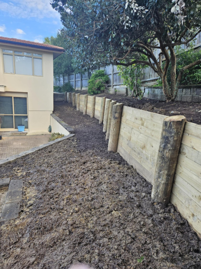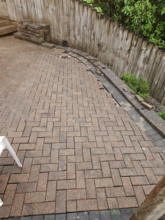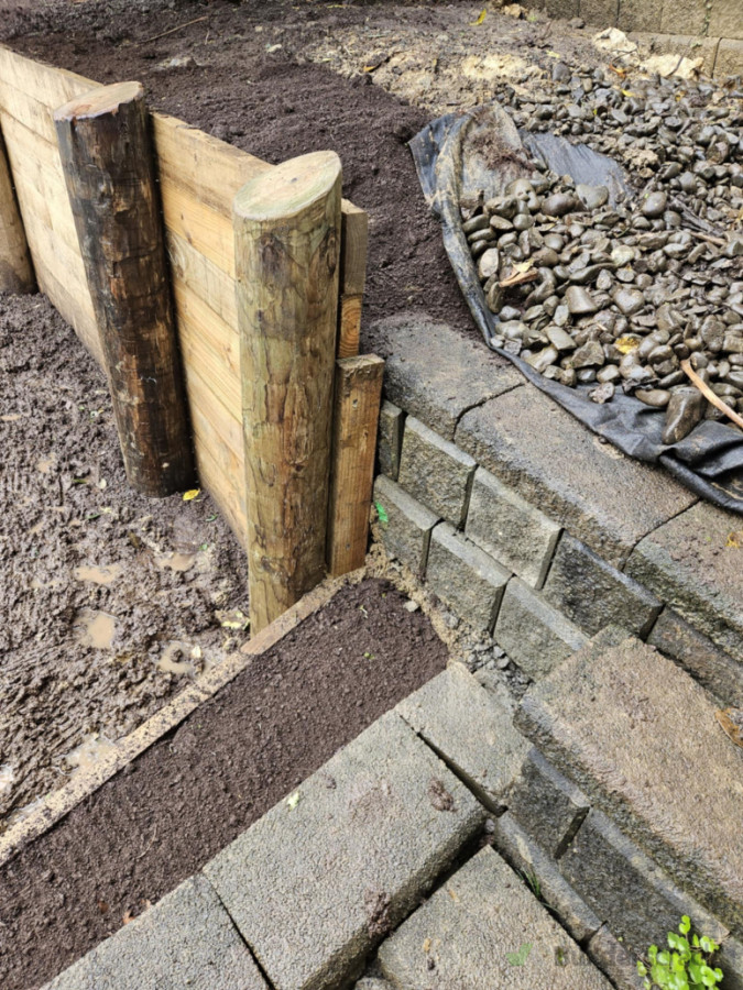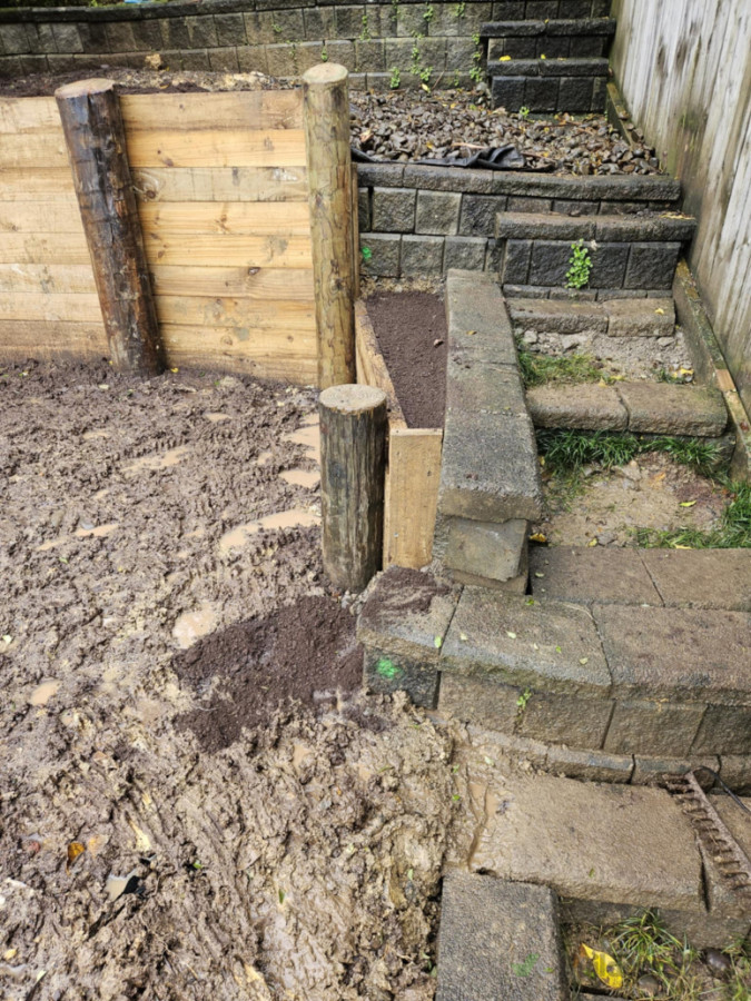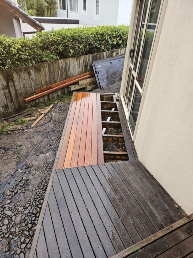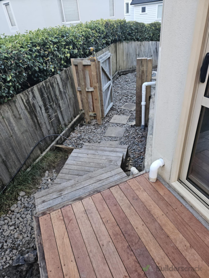 Fixing the pavers Removing the old small rotten deck and installing a new one Installing a wooden gate Levelling the topsoil Tidying up the steps