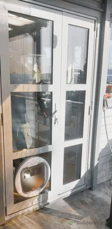 Replacing Client's Timber Door with new Aluminum Hinged Door with Double Glazed Glass and a Dog Door.