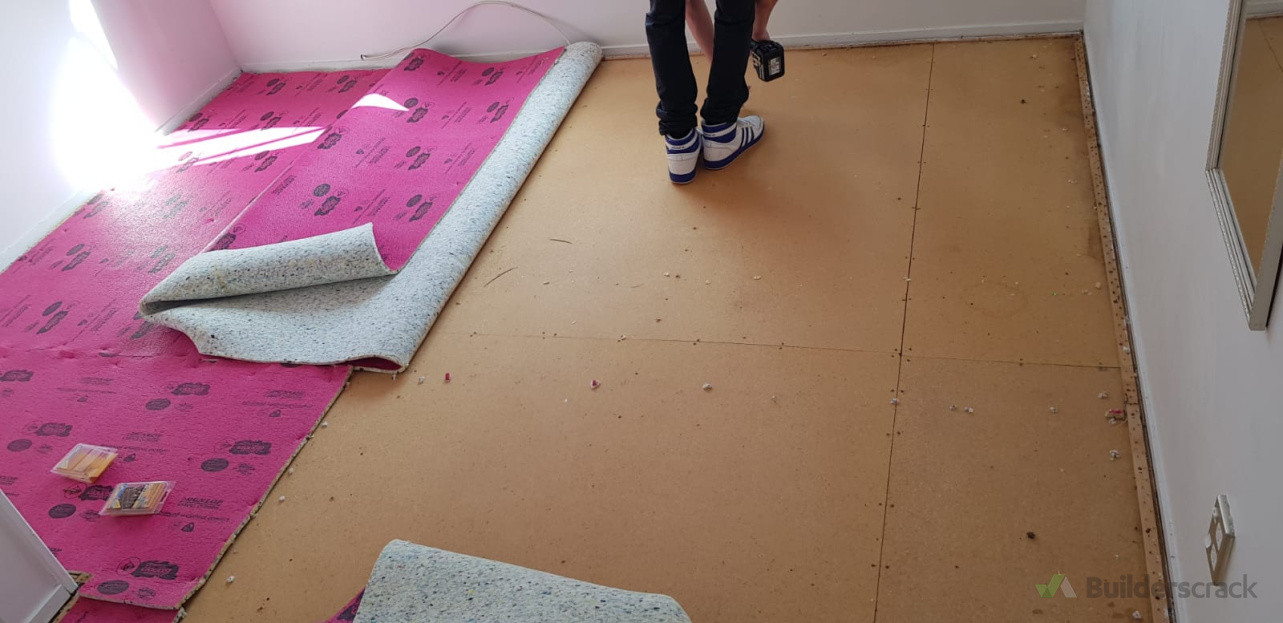 – Pulled back the carpet in an upstairs bedroom to secure the floorboards by screwing them down