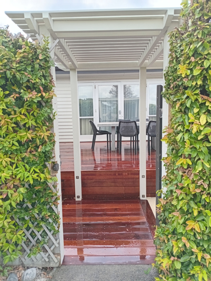 Design + pergola + kwila decking + stairs + retaining walls + corten steel edge + screens