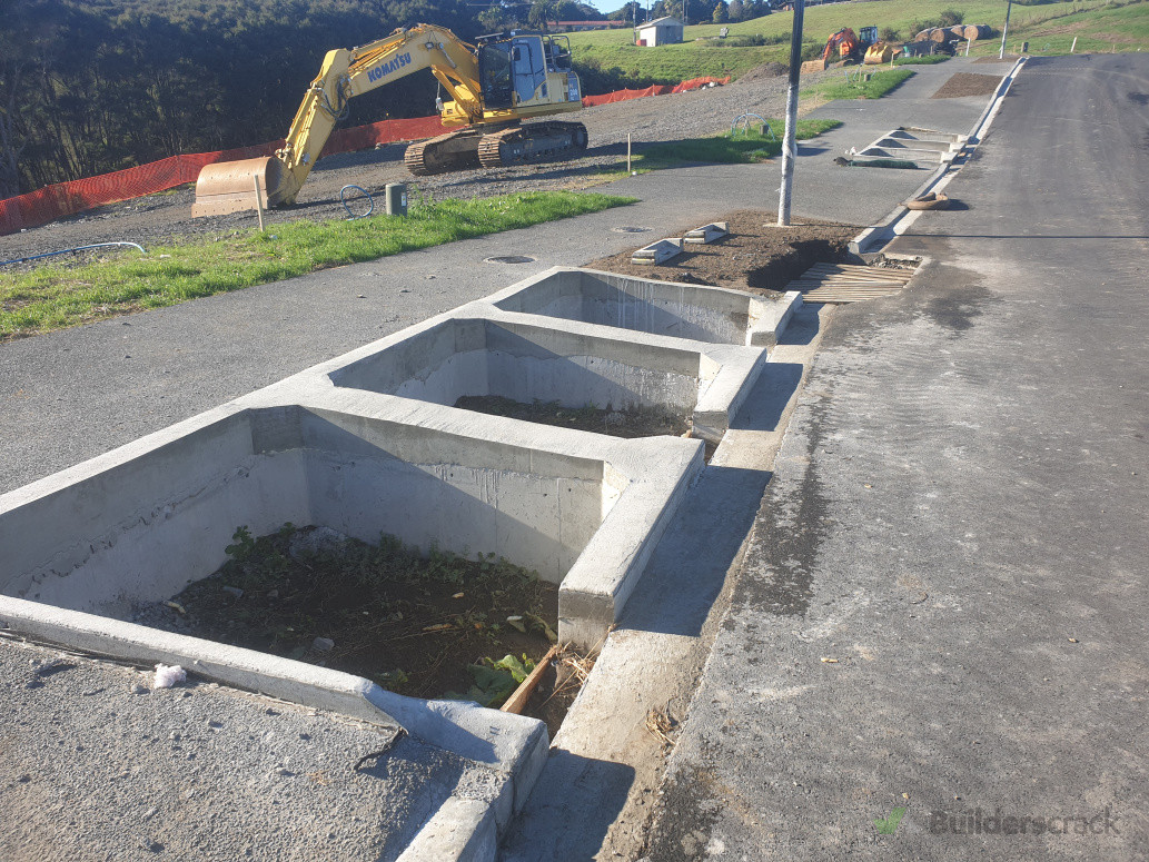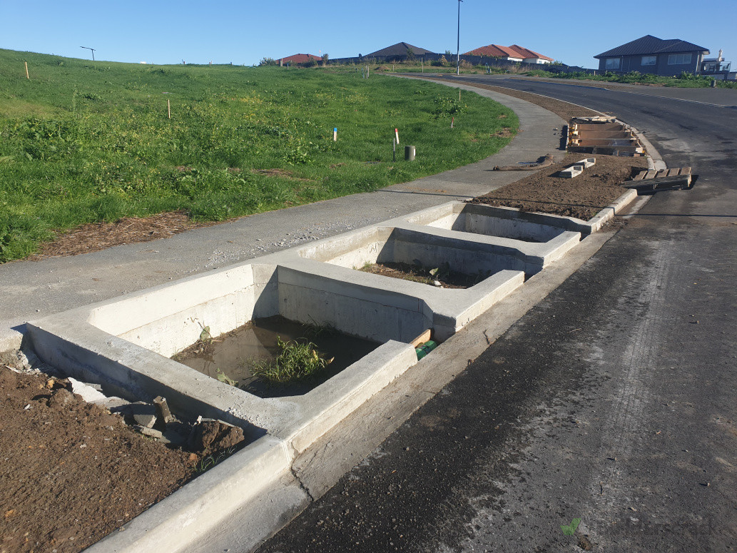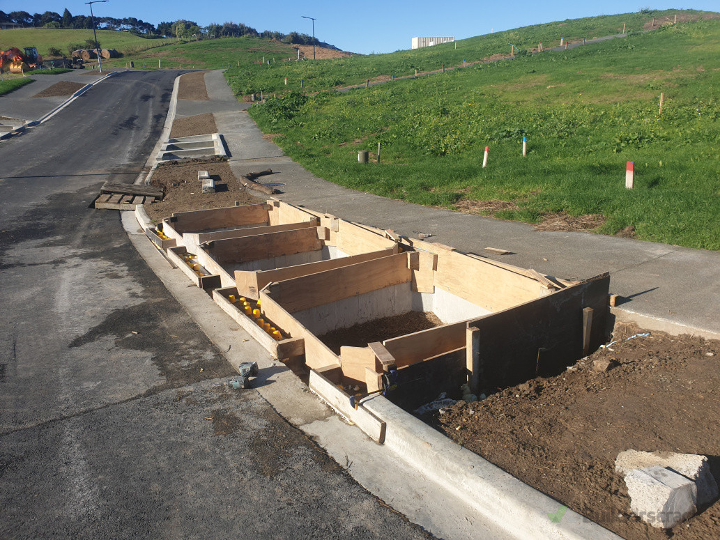 We drilled and set 12mm rebar in the existing raingardens, then boxed the insides and outside.