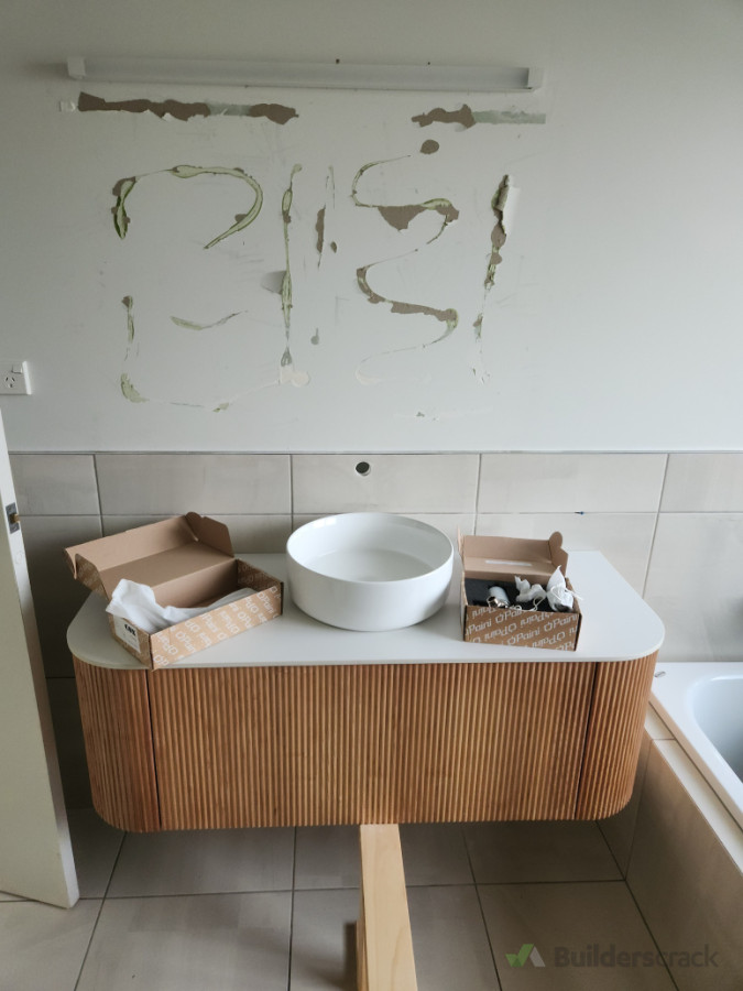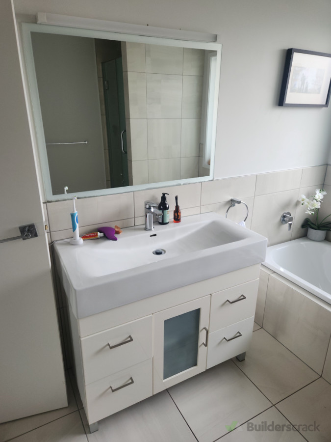 remove existing dated vanity, paint bathroom, install new vanity and mirror, amazing what you can do in 2 days