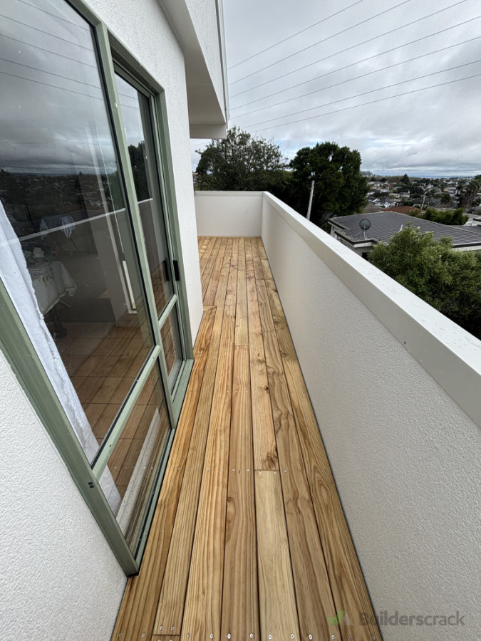 Ripped up the old leaking deck laid down a new membrane and floated a new pine 140mm x32mm deck overtop. Also add a cap flashing to the handrail with a new sto plaster overlay to the walls.
