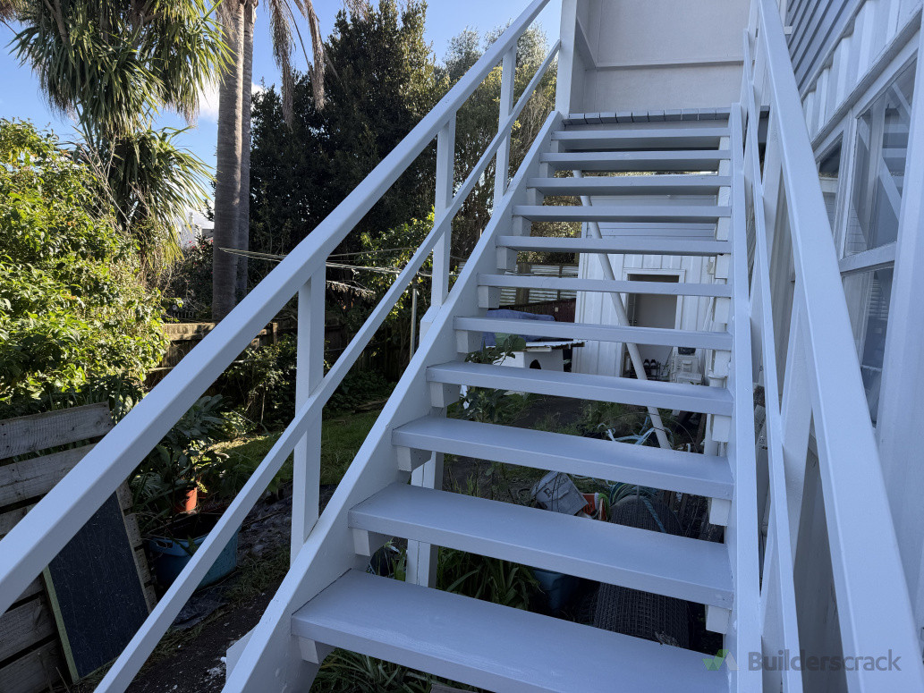 Remove and replace the broken stringer and stair tread with new ones, then apply a fresh coat of paint on top.