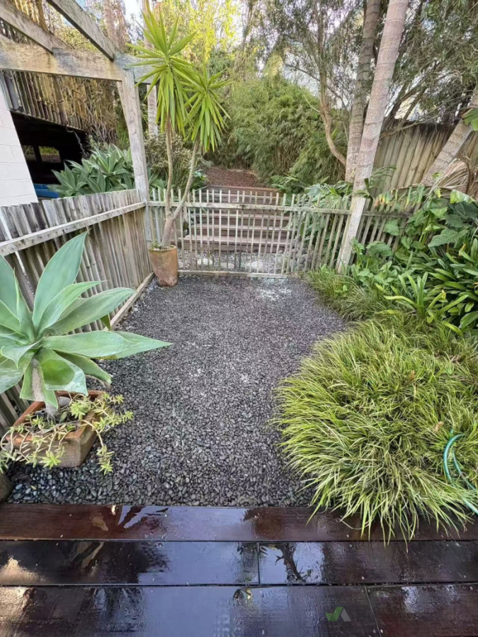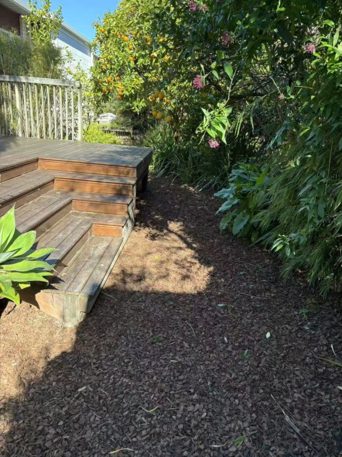 Garden restoration and groundwork, including clean-up work, digging out muddy areas, supplying and laying quality topsoil, laying mulch above garden steps, laying pebbles below garden steps and over levelled soil.