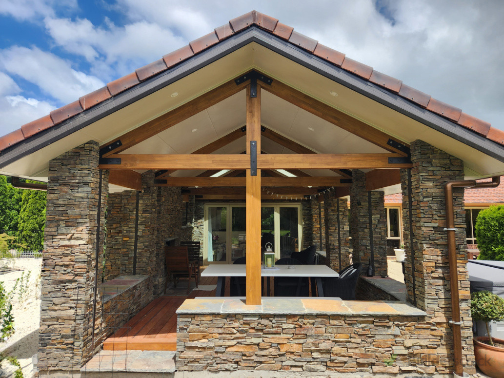New bifold doors extend the once-closed-off living room out to this beautiful outdoor area. The combination of engineered exposed trusses, garapa decking and schist supplied by Midland Brick, our supplier of choice for all things brick, make this a standout! Equipped with an open fire and blinds to close off the outside world this will be a cozy space even in the middle of winter.