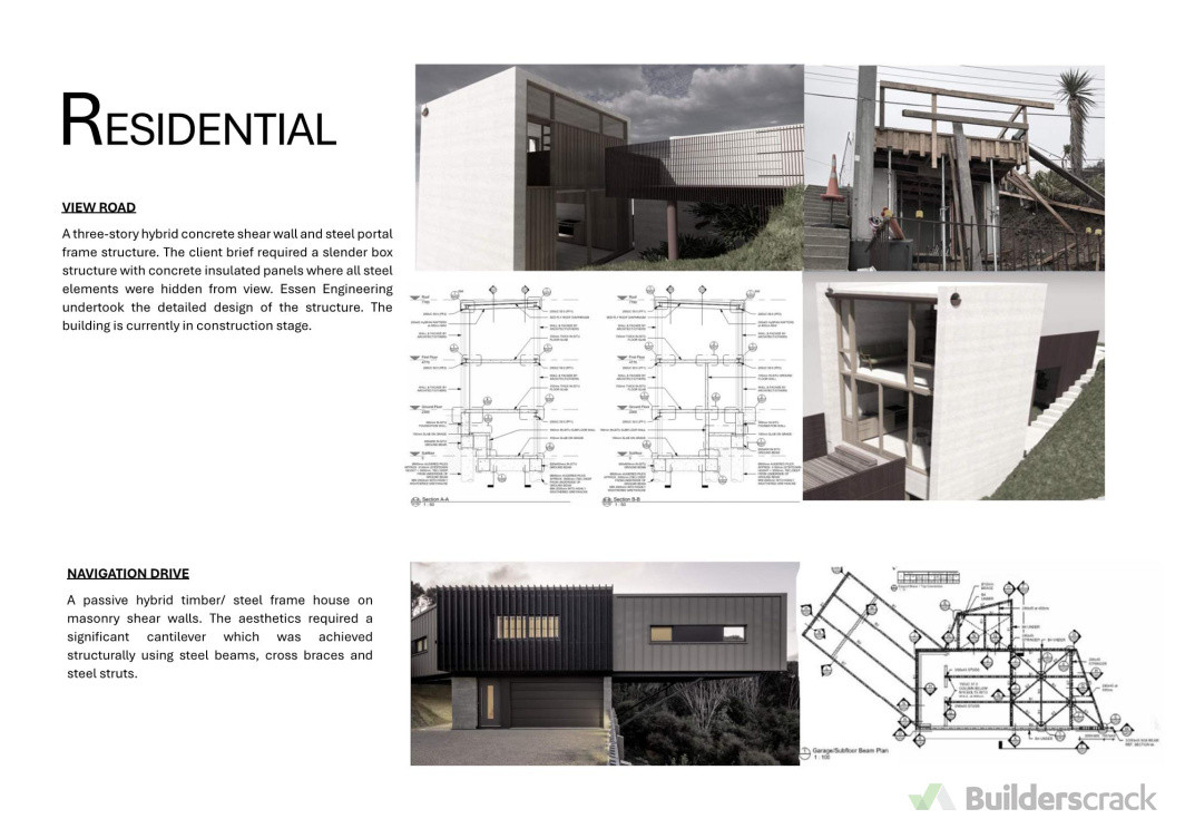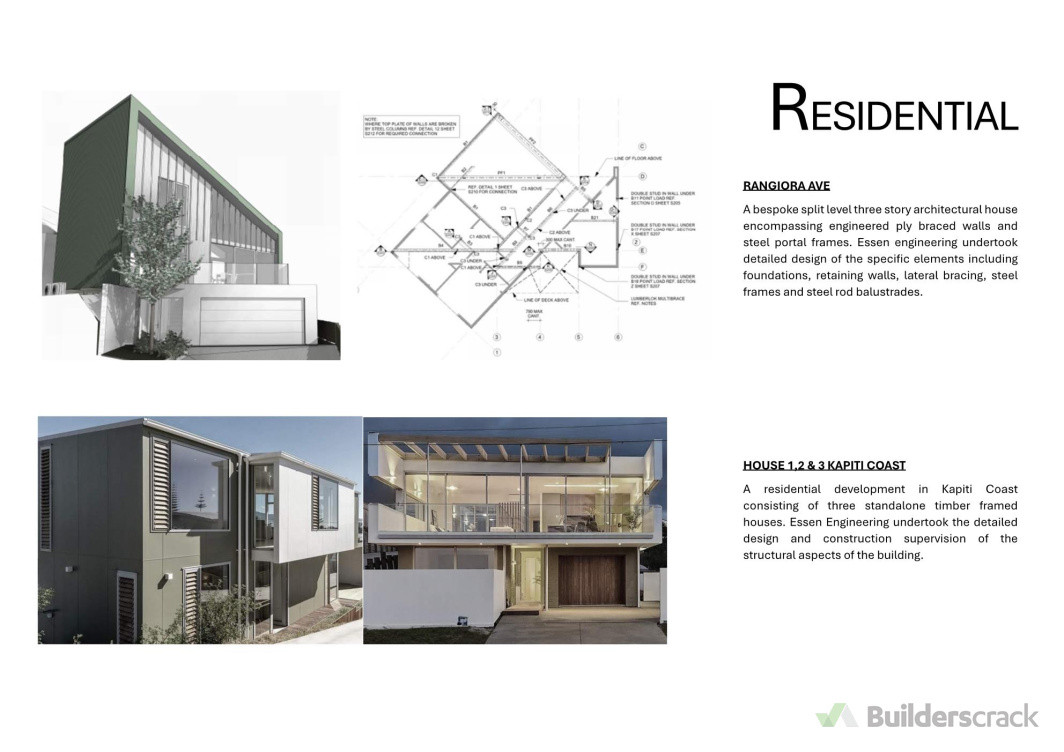 A bespoke split level three story architectural house encompassing engineered ply braced walls and steel portal frames. Essen engineering undertook detailed design of the specific elements including foundations, retaining walls, lateral bracing, steel frames and steel rod balustrades.