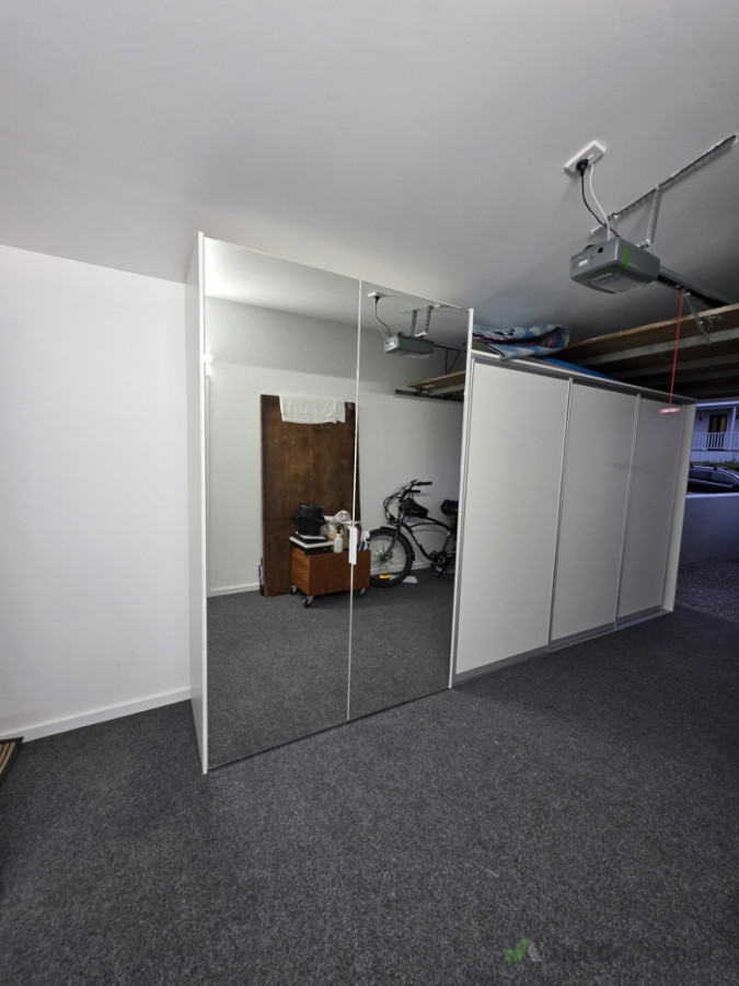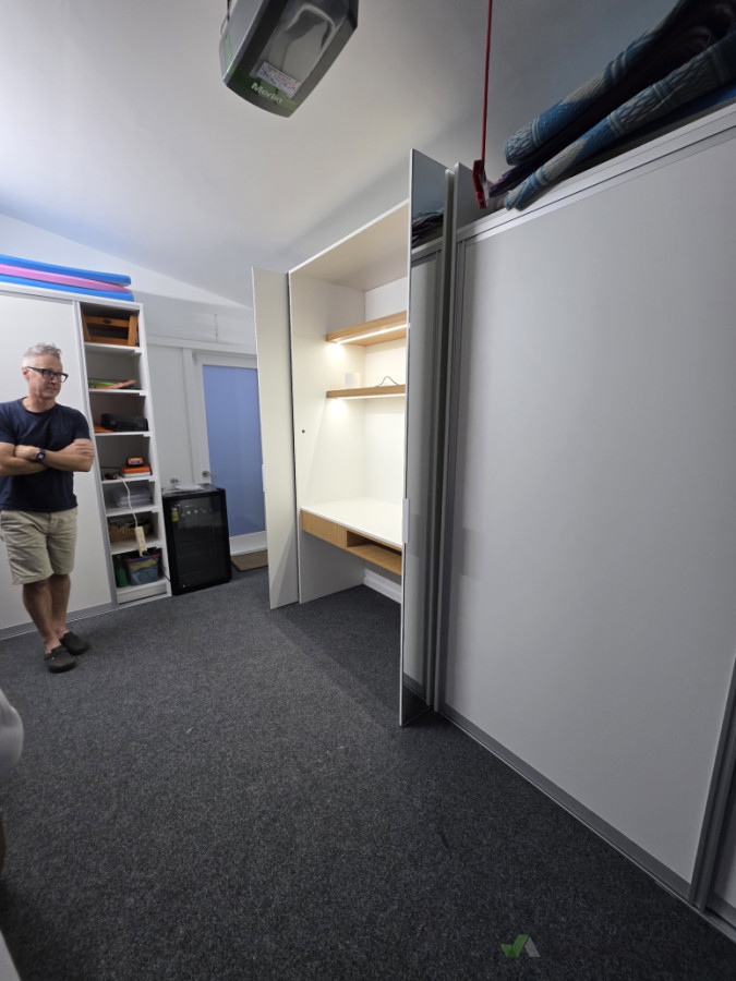 The unused garage area was successfully converted into a stylish, functional home office. The pocket doors and mirrored sliders made the space feel larger and more open, while the slat shelving provided practical, clean storage solutions. The client was extremely happy with the transformation and the clever use of available space.