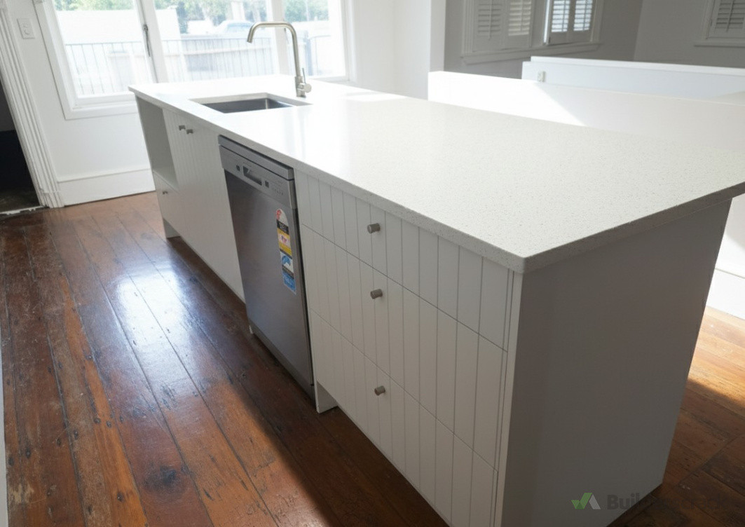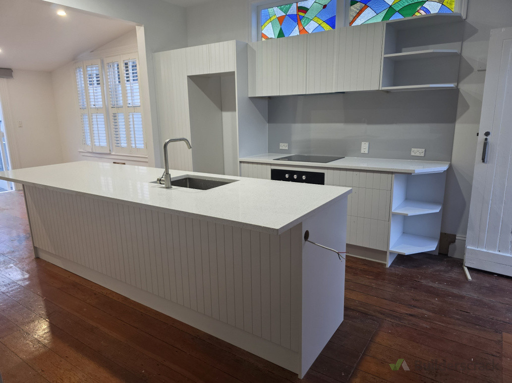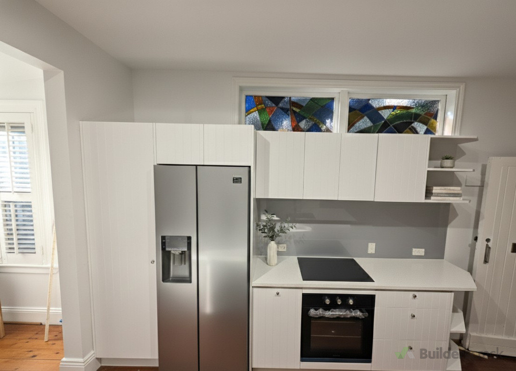 The final kitchen delivered a bright, modern, and elegant look. The V-groove painted finish provided a stylish texture, while the Snow White benchtop added a luxurious, clean appearance. With new appliances and a stainless steel sink, the space became both functional and visually stunning. The client loved the premium workmanship and attention to detail.