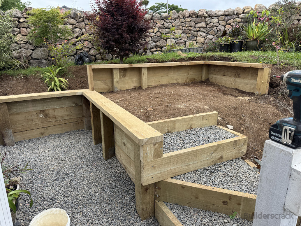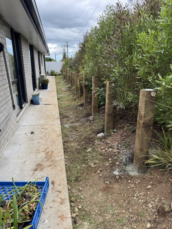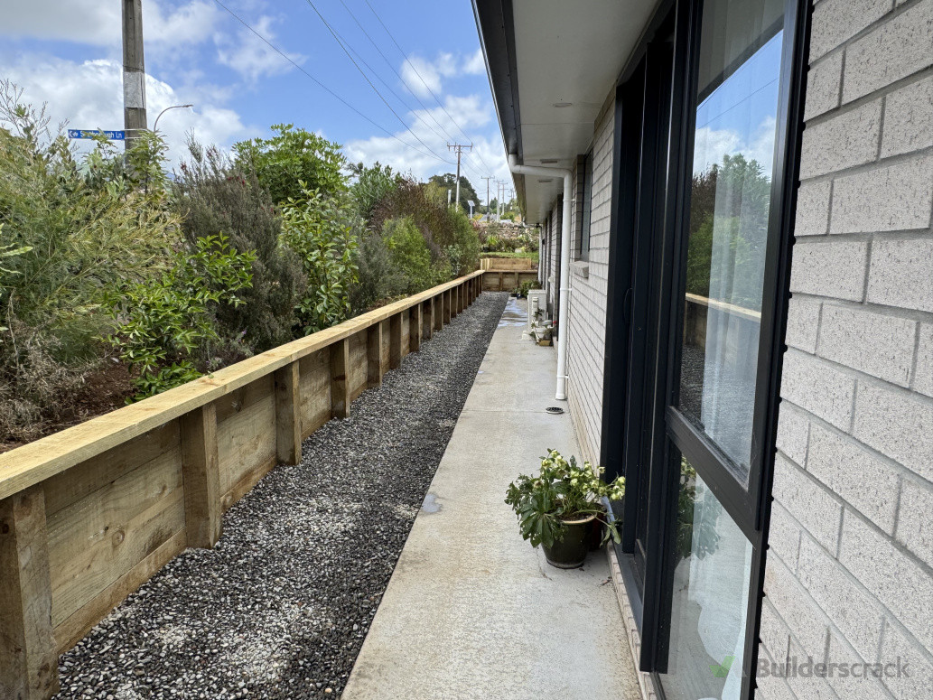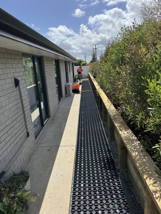 We transformed this backyard into a low maintenance area for our lovely client who wants less mess to deal with by adding a permeable pebblelock grid system with river stone infill, along with a retaining wall that doubles as a planter box and a raised veggie garden area with stairs for access.
