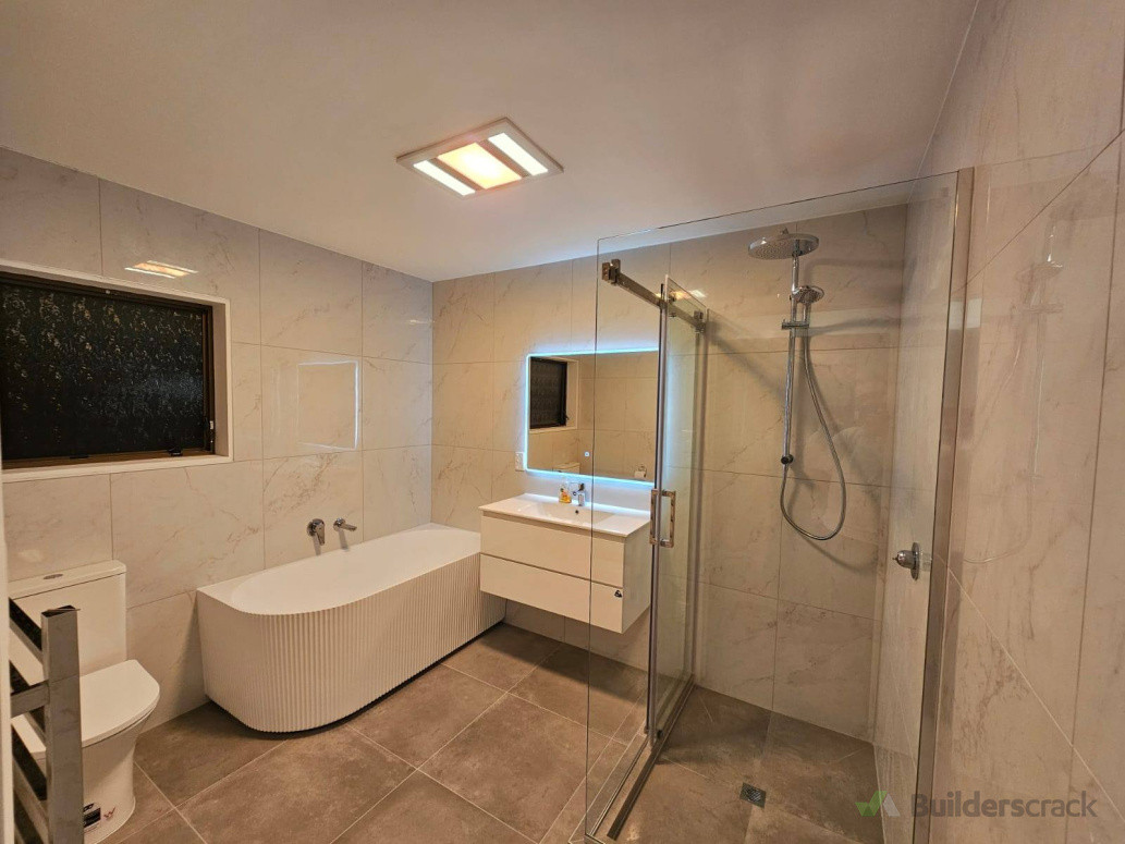 Complete bathroom renovation featuring new tiles, frameless glass shower, freestanding bathtub, floating vanity, LED mirror, and upgraded fixtures for a sleek, modern finish.