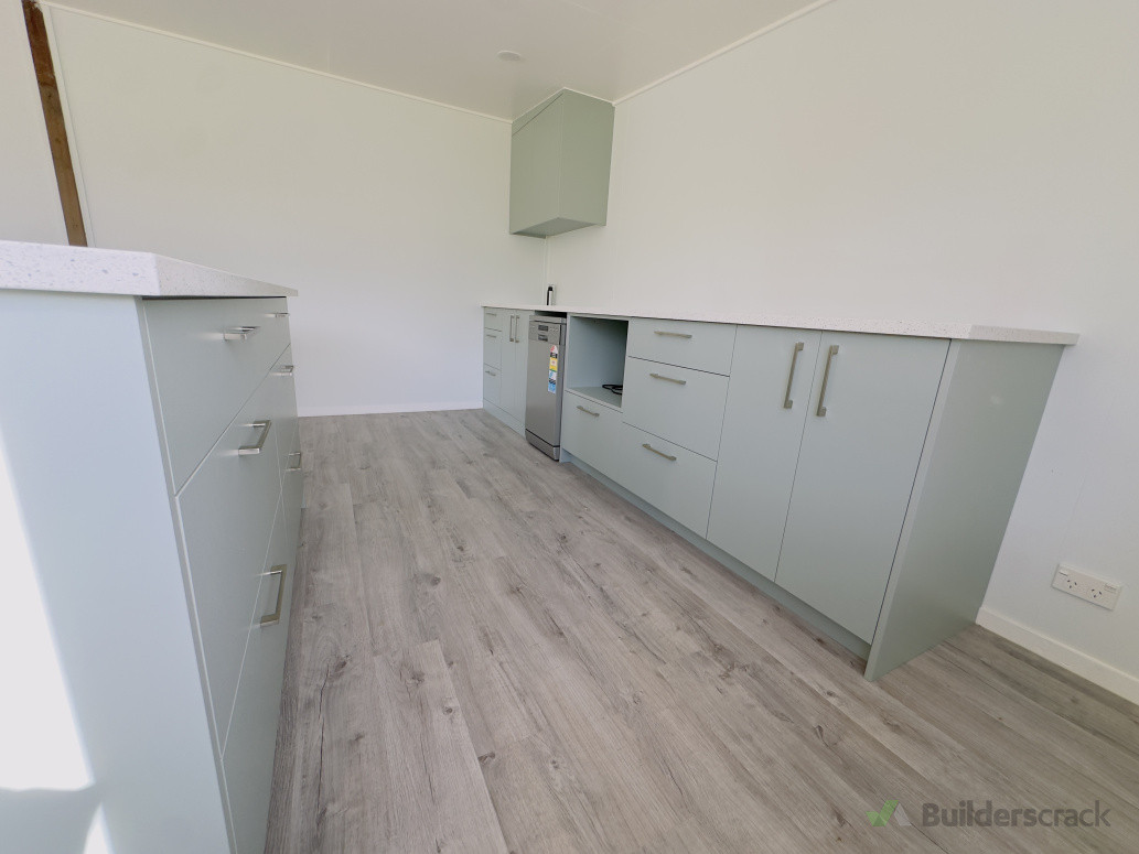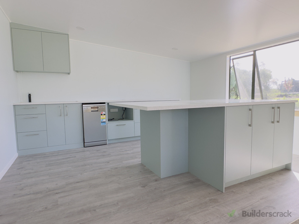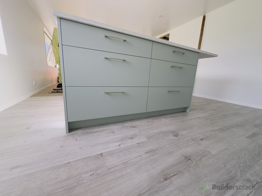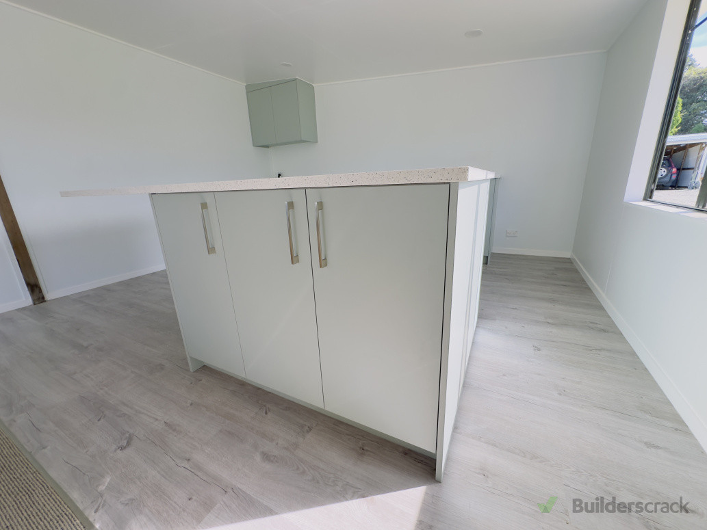 The finished kitchen features a stunning Spinifex colour scheme paired with elegant White Diamond engineered stone benchtops. A comfortable seating area for three was incorporated to maximise usability without compromising on space. Every detail was carefully considered to ensure both efficiency and visual appeal.