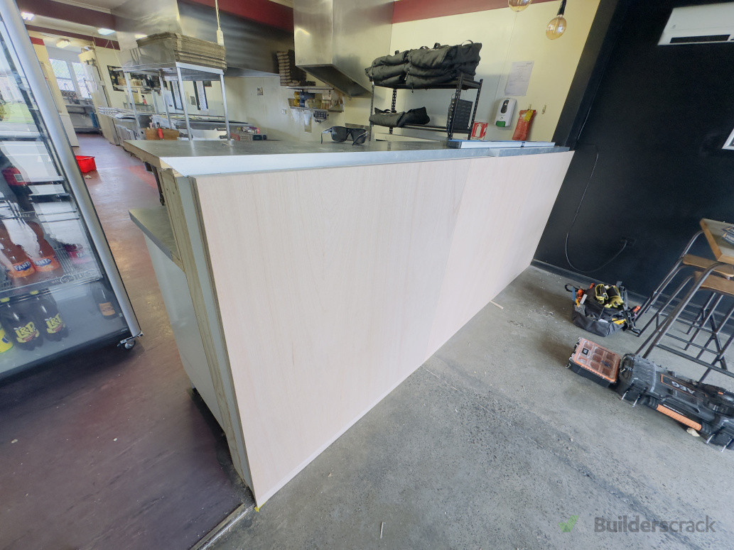 Below the benchtop, we installed Meranti ply cladding and skirting, chosen for its strength and clean finish — ideal for a busy food environment. These components were professionally painted in Mirotone Black, 30% gloss, by Freeman Hastings. The glossy black finish creates a bold contrast against the timber, giving the counter a modern, striking presence that fits perfectly with Hell Pizza’s brand.