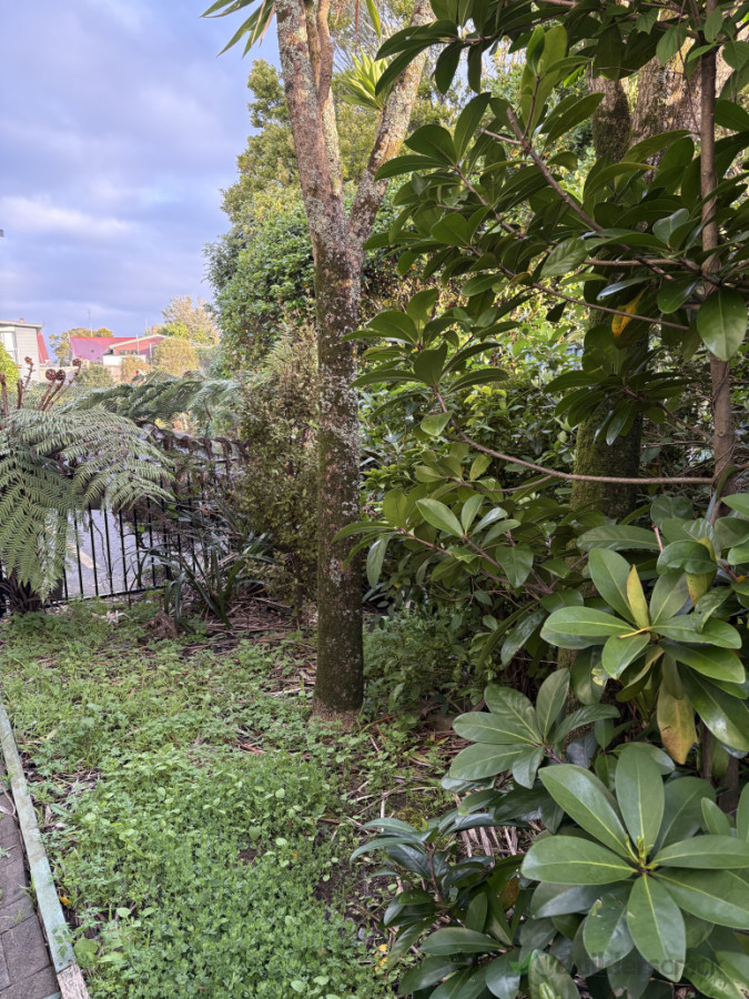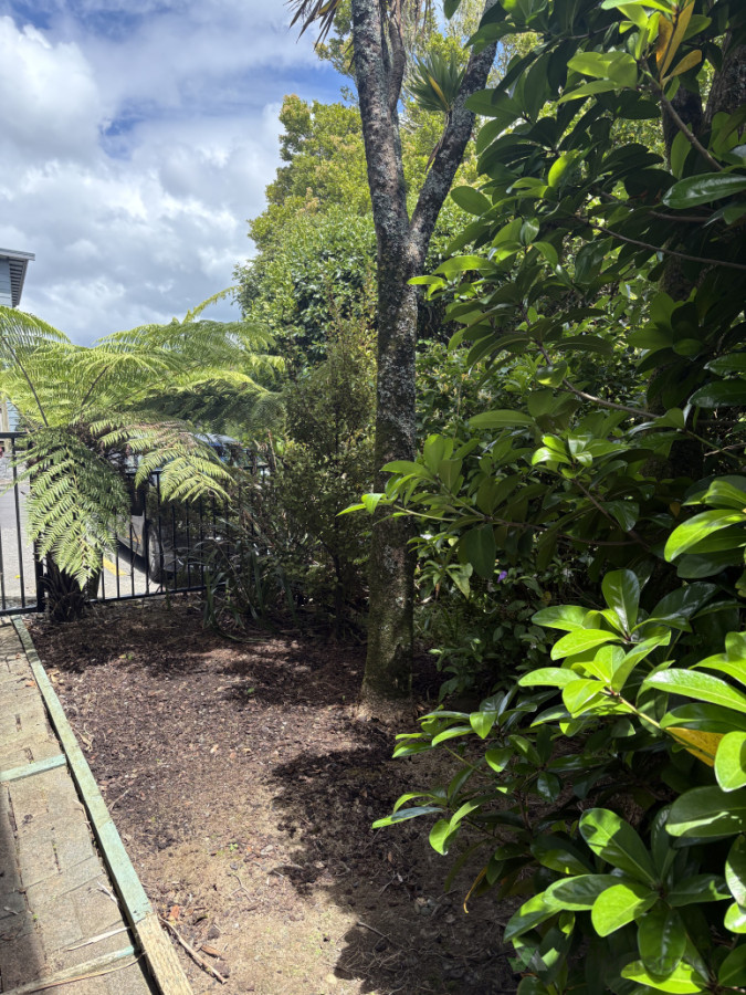 Spraying and manual removal of weeds from a side of townhouse