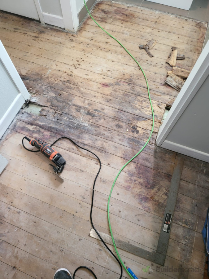 Repaired a few water damaged boards and sand and poly in bathroom area