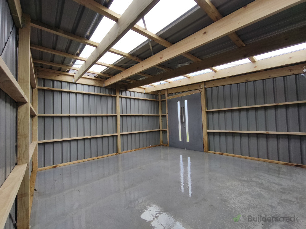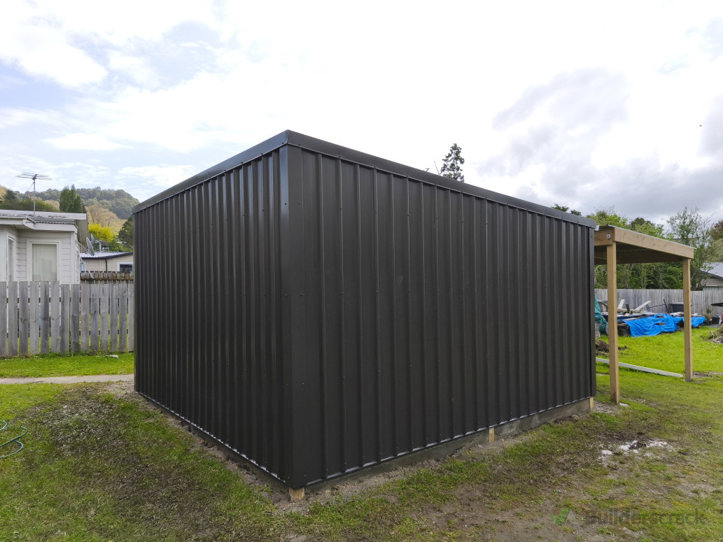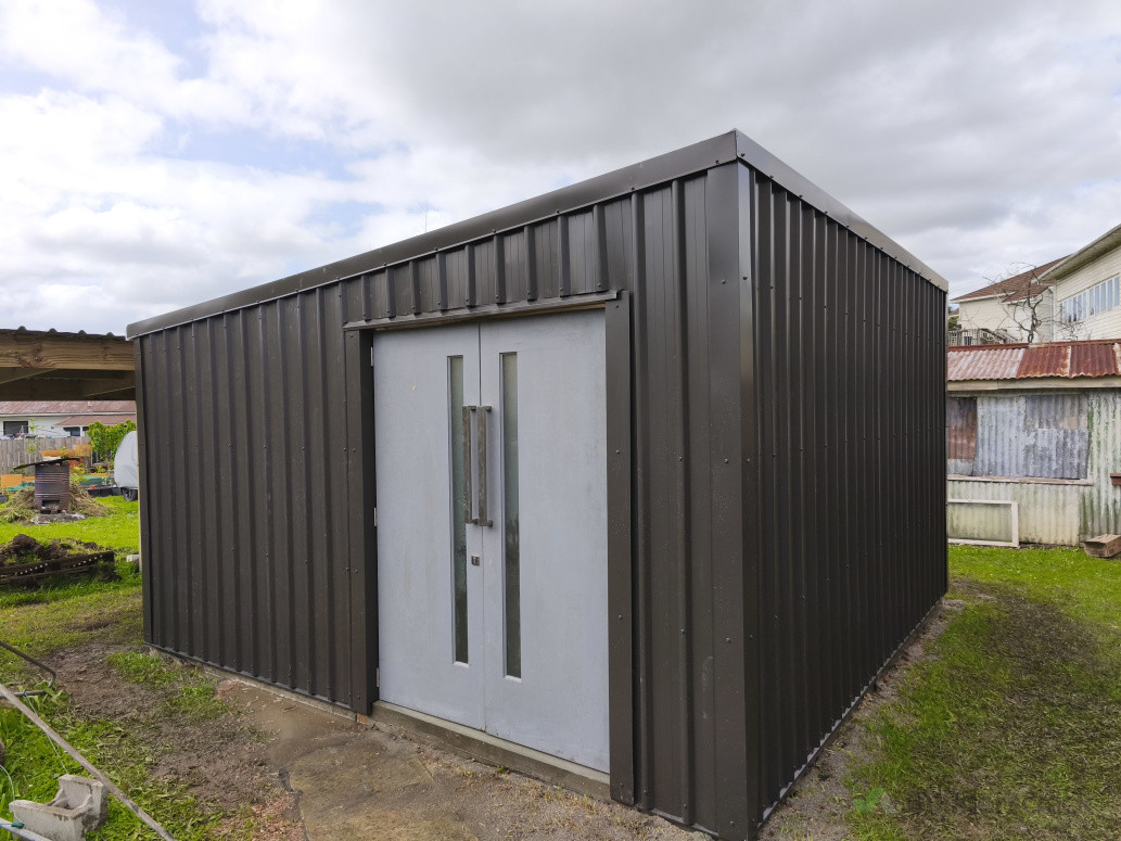 Medium sized tool shed/ storage shed with concrete pad. Clad in TR5 colour steel with flashed corners and custom doors.