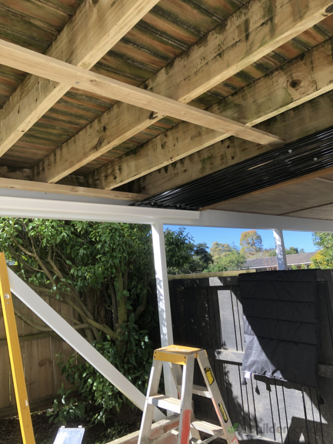 Installed roofing sheets with fall under deck area to create a sheltered space plus gutter install