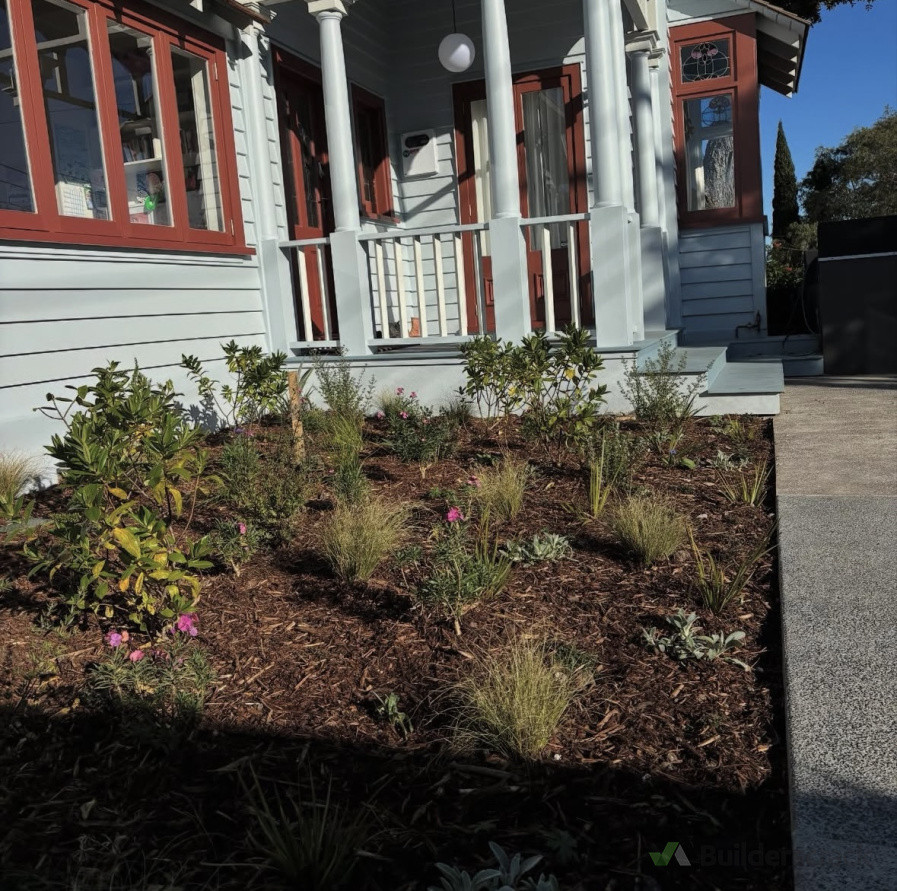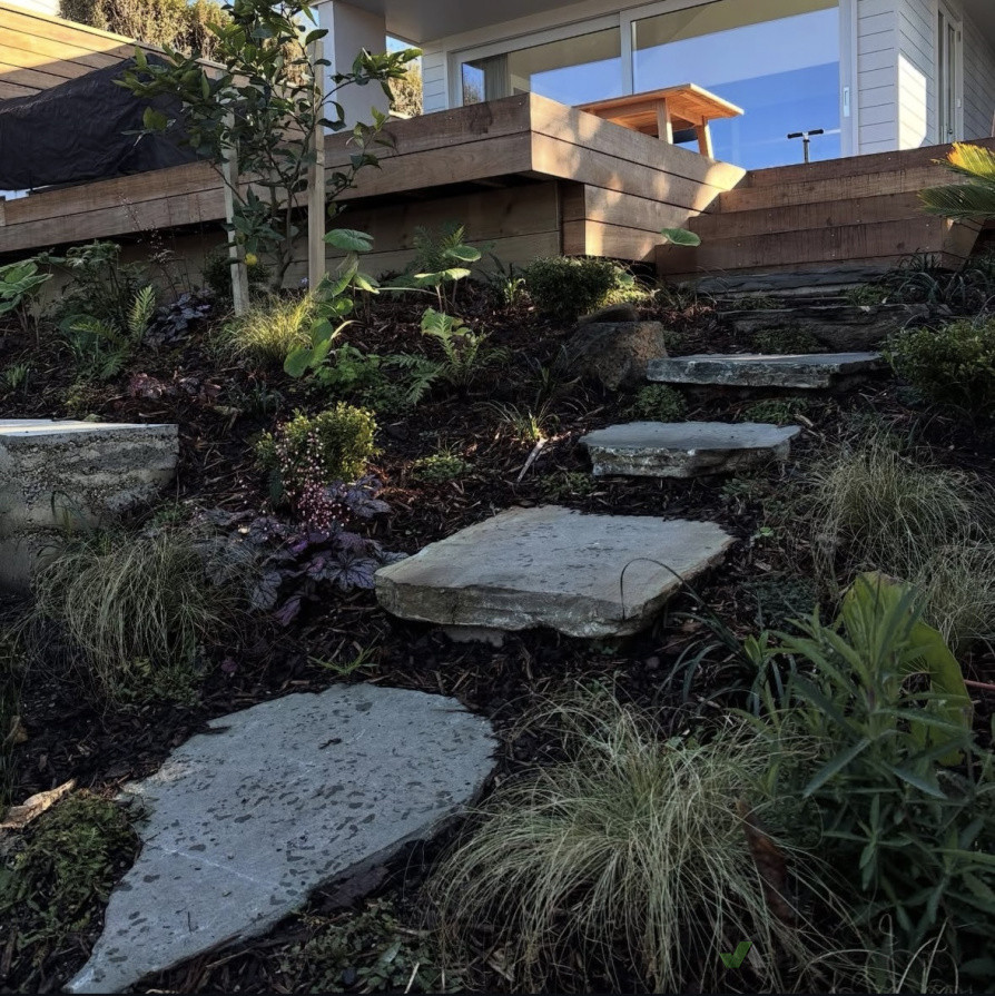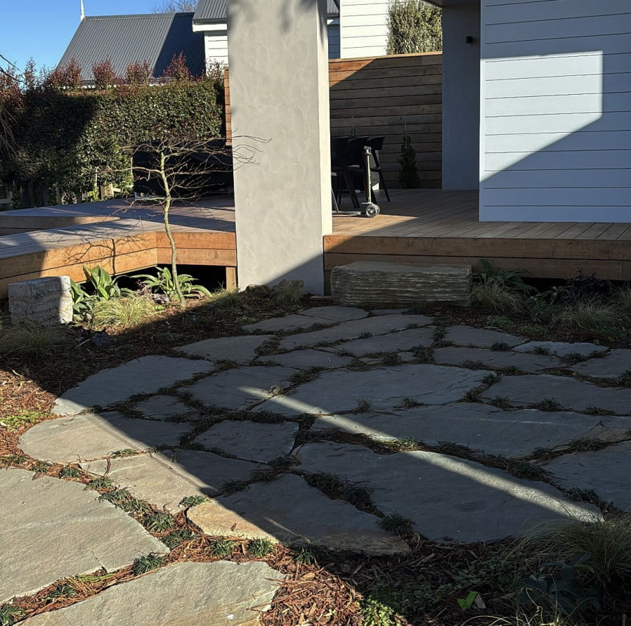 Curved bench seat to act as a retaining wall to eliminate the need for a balustrade on the deck and to serve as functional. Complete with paradise paving, garden and ready lawn install to polish the look.