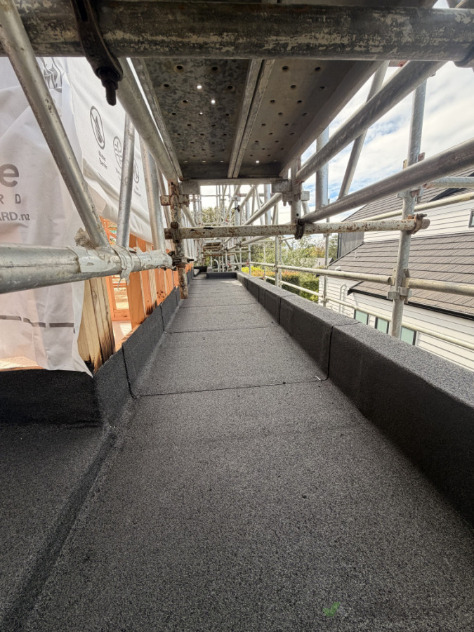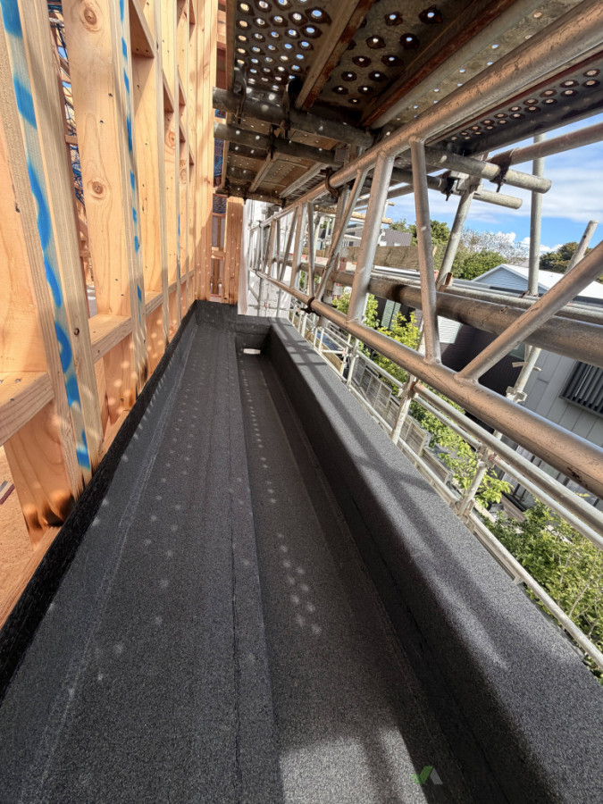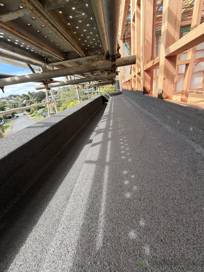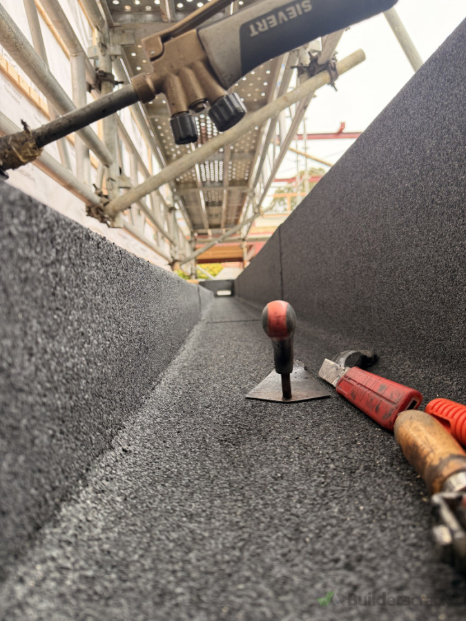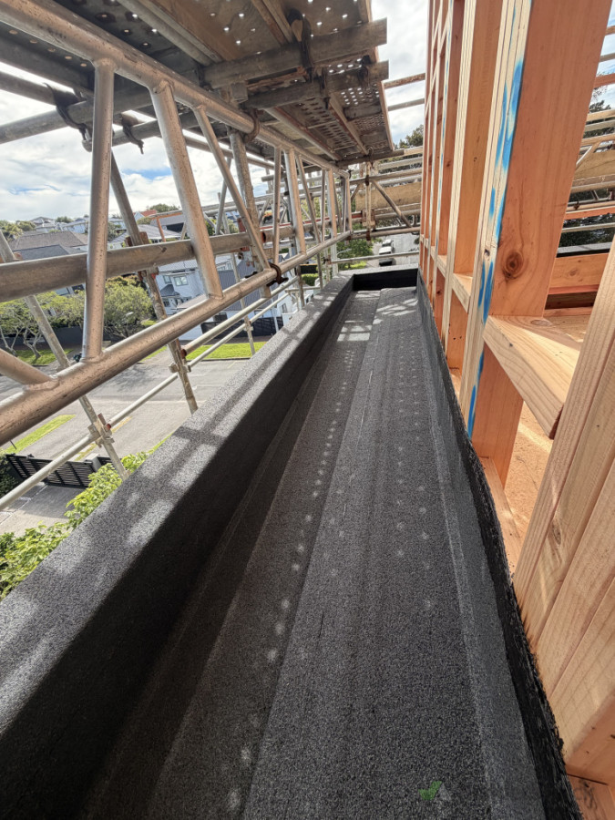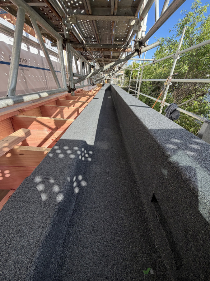 New internal gutter waterproofed with double layer torch-on membrane.